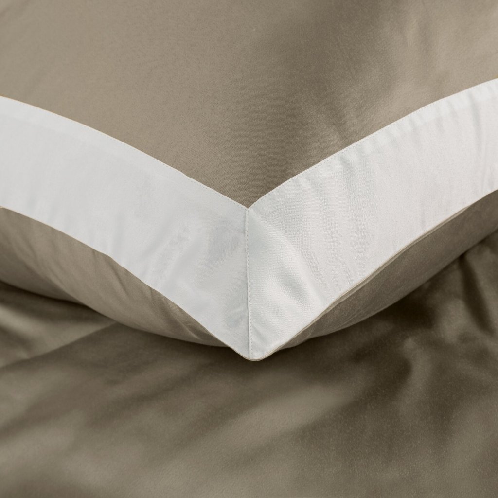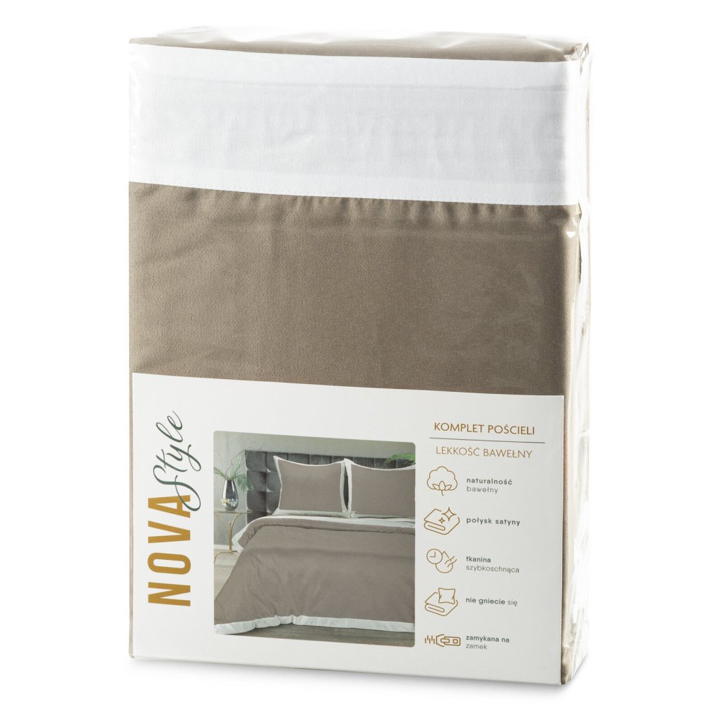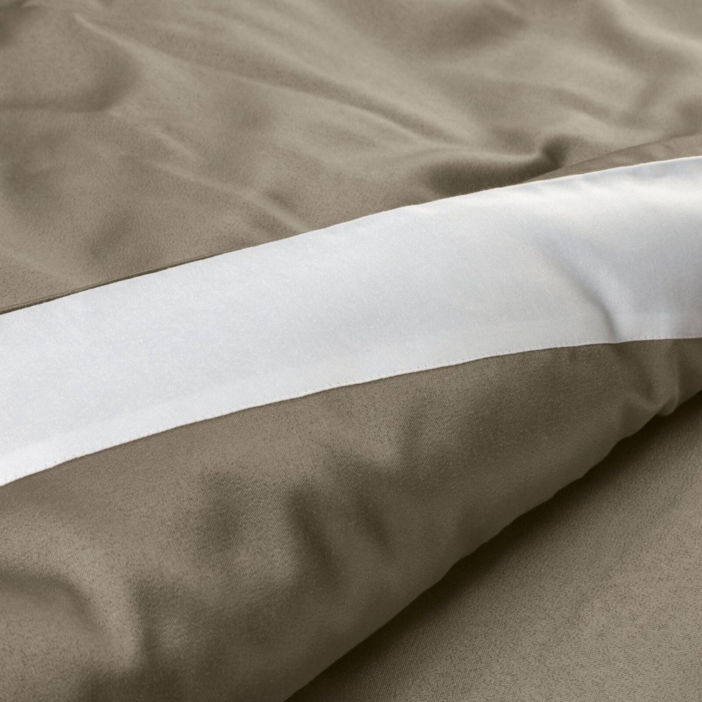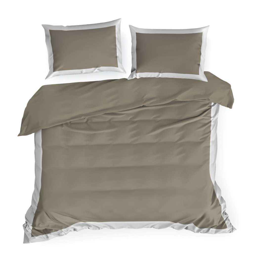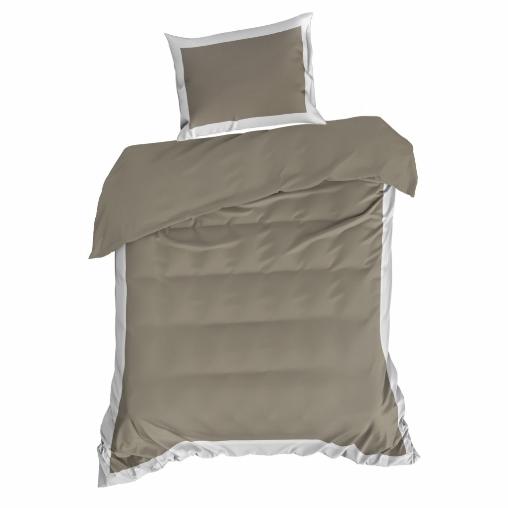 Saténové bavlněné povlečení s ozdobným barevným lemem, šířka: 220 cm, délka: 200 cm, povlaky na polštář: 2 ks 70x80 cm, barva: tmavě béžová a bílá, hmotnost: 125 GSM, složení: 55 % bavlna, 45 % polyester.Doplňkové parametry