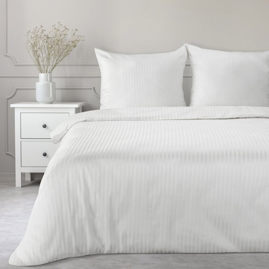 Jednobarevná ložní souprava s pruhy ze saténového damašku, šířka: 200 cm, délka: 220 cm, 2 ks 70x80 cm, barva: bílá, gramáž: 125 GSM, složení: 100% bavlna.Doplňkové parametry