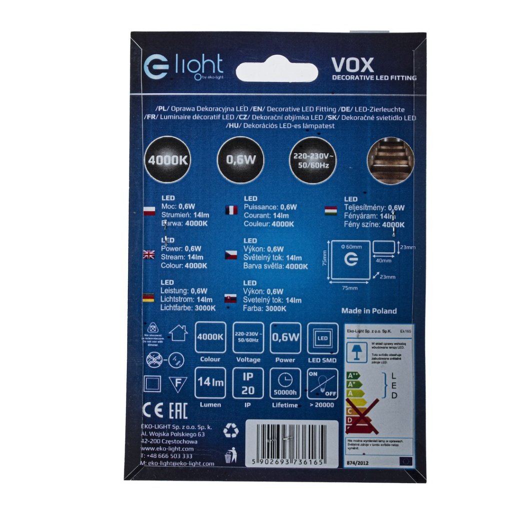 Schodišťová LED svítilna z kolekce Vox je moderním řešením pro dekorativní a funkční osvětlení interiérů. Skvěle se hodí jako osvětlení chodeb , svícení na schodišti , podsvícení nábytku nebo k vytváření jednoduchých, ale efektivních světelných kompozicí . Montáž probíhá do instalační krabice o průměru 60 cm a svítidlo se připojuje přímo na napětí 230V , což umožňuje rychlou a praktickou instalaci bez dalších prvků.