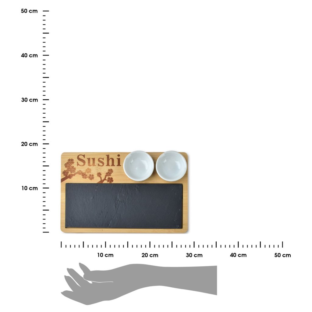 Sushi set s bambusovým podnosem je nepostradatelným prvkem pro každého milovníka japonské kuchyně. Podnos z přírodního bambusu, zdobený jemným motivem třešňových květů a nápisem "Sushi", spojuje estetiku a funkčnost. Ústředním prvkem soupravy je břidlicová deska, ideální pro podávání sushi a jiných pochutin, která udržuje vhodnou teplotu podávaných jídel. Souprava obsahuje také dvě porcelánové misky na sójovou omáčku nebo wasabi, dva stojany a dva páry bambusových hůlek, které perfektně padnou do ruky a usnadní pohodlné jídlo. Celá sada byla navržena s ohledem na eleganci a praktičnost, díky čemuž má každé jídlo jedinečný charakter. Nejde jen o praktický set pro každodenní použití, ale také o perfektní tip na dárek pro nadšence sushi a orientální kuchyně.Rozměry: 29x19x3,5 cm