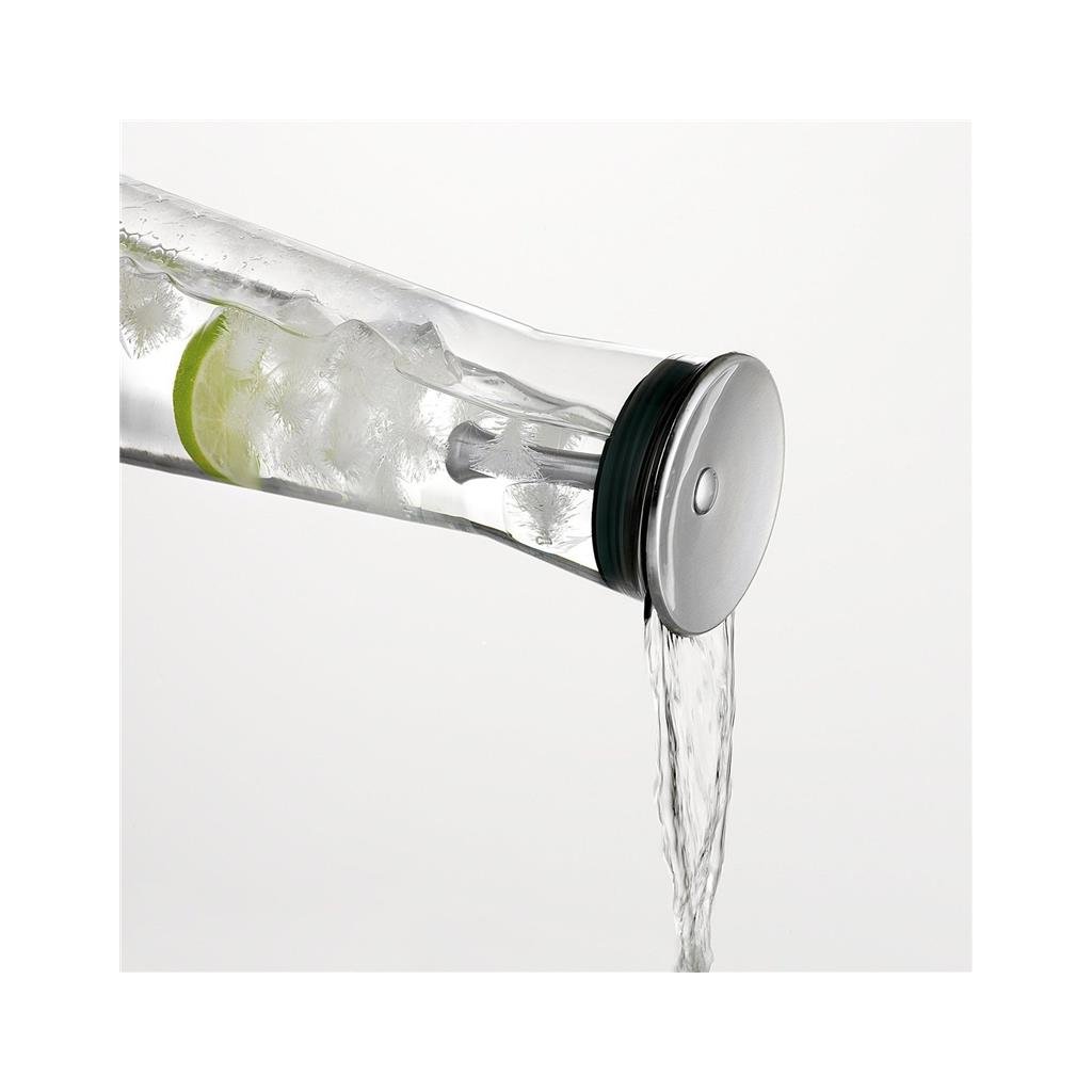 Skleněné karafy na vodu INDIS jsou vyrobeny z vysoce kvalitního žáruvzdorného skla, které je odolné vůči teplotám od -40 °C do 300 °C a je určeno pro styk s potravinami. Sklo SIMAX má vysokou odolnost vůči chemikáliím; je hladké a neporézní, dokonale průhledné a odolné vůči korozi. Skleněná karafa má objem 1,1 l a je ideální pro vodu s mátou a citronem. Skleněná karafa má moderní design. Pro nalití vody do sklenice není třeba z karafy odstraňovat kovovou zátku - stačí karafu naklonit a sítko, které je součástí zátky karafy, udrží kousky citronu nebo máty.Skleněná karafa