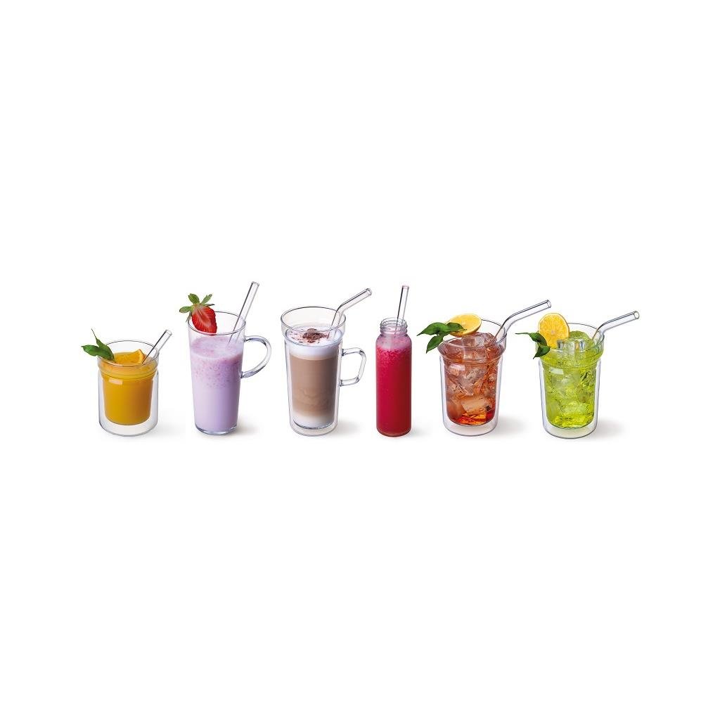 Skleněná brčka se snadno čistí: lze je mýt v myčce nádobí nebo v malém množství vody s prostředkem na mytí nádobí a přiloženým kartáčkem.