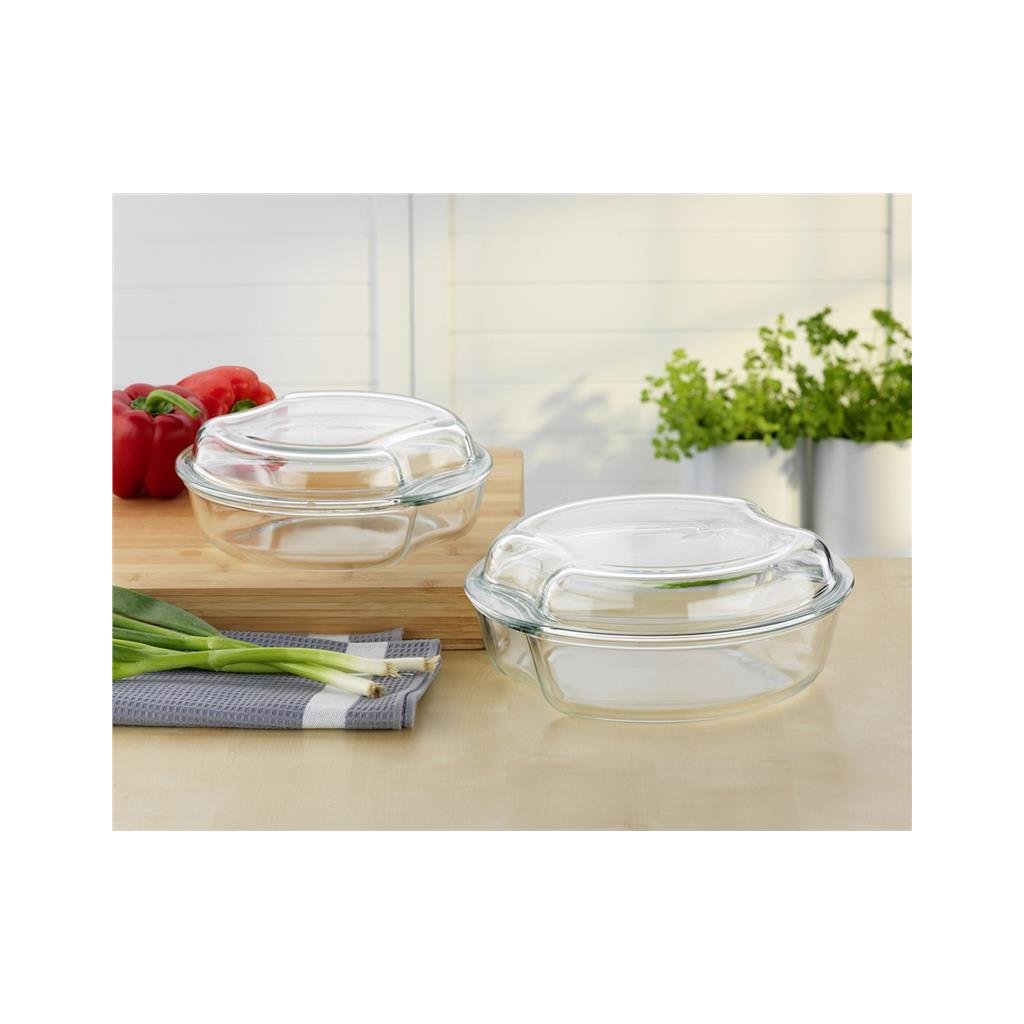 Sklenice SMART TOUCH se vyznačuje moderním tvarem a bezpečnou rukojetí; je vyrobena z vysoce kvalitního žáruvzdorného skla, které je odolné vůči teplotám od -40 °C do 300 °C a je určeno pro styk s potravinami. Sklo SIMAX je vysoce odolné vůči chemikáliím; je hladké a neporézní, dokonale průhledné a odolné vůči korozi. Skleněná nádoba je velmi praktická, protože je všestranně použitelná - hodí se na pečení, servírování, skladování v chladu i ohřívání potravin.Kulatá žáruvzdorná nádoba s víkem/formou na pečení, zapékání pokrmů ve všech typech trub