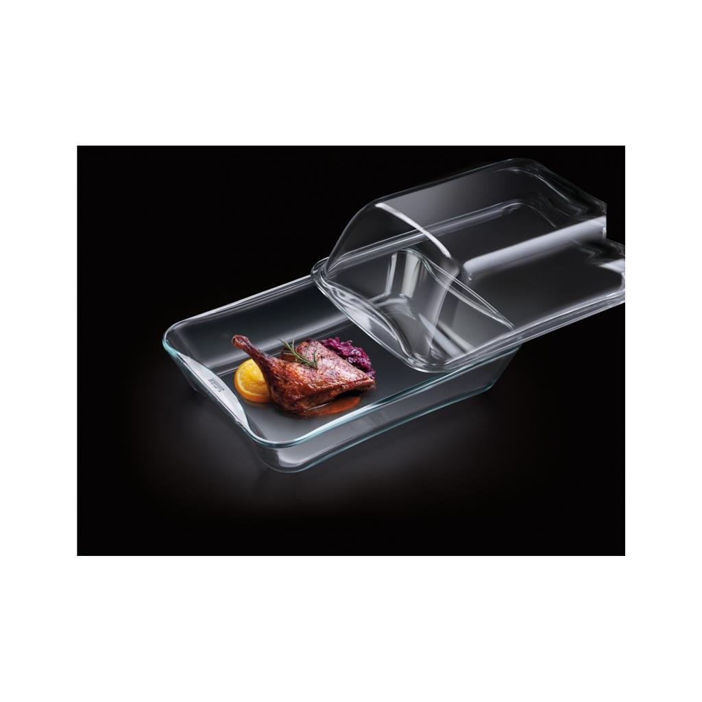 Skleněné nádobí SMART TOUCH se vyznačuje moderním tvarem a bezpečnou rukojetí; je vyrobeno z vysoce kvalitního žáruvzdorného skla, které je odolné vůči teplotám od -40 °C do 300 °C a je určeno pro styk s potravinami. Sklo SIMAX je vysoce odolné vůči chemikáliím; je hladké a neporézní, dokonale průhledné a odolné vůči korozi. Skleněná nádoba je velmi praktická, protože je univerzální - vhodná na pečení, servírování, skladování v chladu, ohřívání potravin.Obdélníková žáruvzdorná nádoba s víkem/formou na pečení, zapékání pokrmů ve všech typech trub.