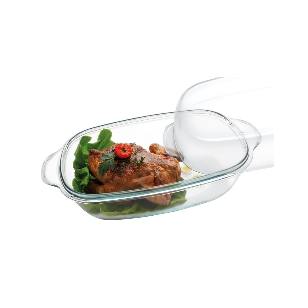Obdélníková skleněná mísa s víkem je vyrobena z vysoce kvalitního žáruvzdorného skla, které je odolné vůči teplotám od -40 °C do 300 °C a je určeno pro styk s potravinami. Sklo SIMAX je vysoce odolné vůči chemikáliím; je hladké a neporézní, dokonale průhledné a odolné vůči korozi. Nádoba má objem 8 l a je univerzálně použitelná - na pečení, dušení i zapékání. Ideální pro přípravu velkých pokrmů, jako je pečení kachny nebo husy.Obdélníková žáruvzdorná nádoba s víkem/formou na pečení a zapékání pokrmů ve všech typech trub