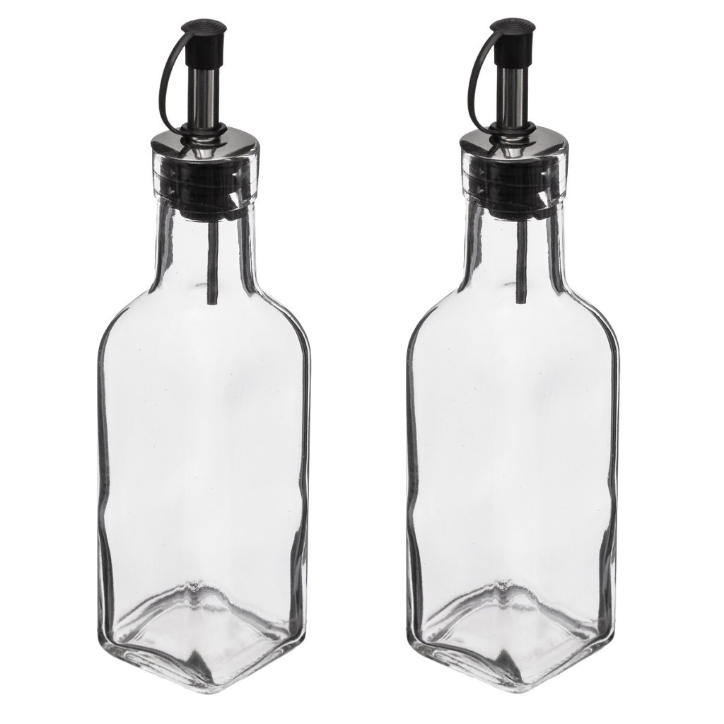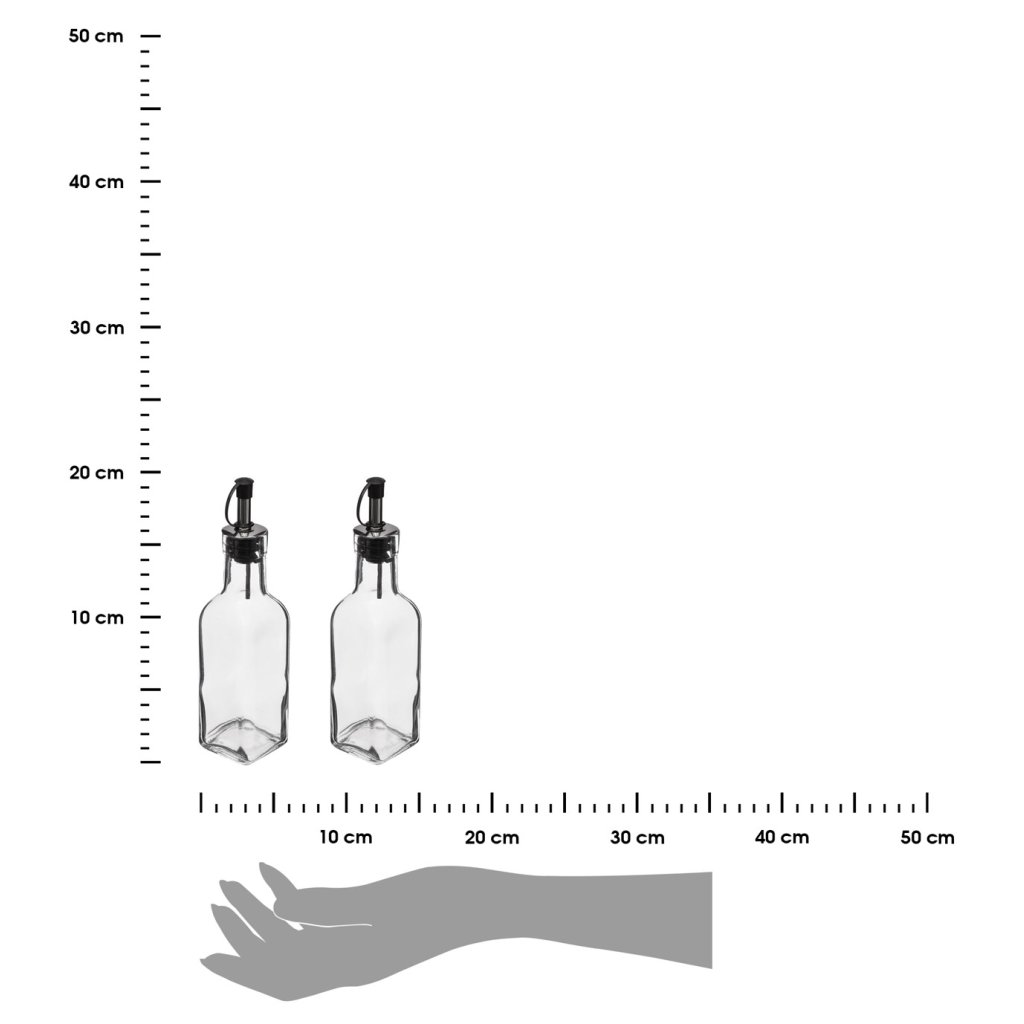 Sada dvou elegantních lahví s praktickým dávkovačem, který umožňuje přesné a snadné nalévání olivového oleje nebo jiného tekutého pepře. Lahve vyrobené z odolného skla jsou nejen praktickým, ale také stylovým dekorativním prvkem každé kuchyně. Díky kompaktním rozměrům jsou ideální pro každodenní použití a průhledný materiál vám umožňuje kontrolovat úroveň obsahu. Kovový dávkovač s pohodlným víkem zabraňuje kapání a chrání před přístupem vzduchu, díky čemuž obsah vydrží déle čerstvý. Ideální pro skladování a podávání olivového oleje, balzamikového octa nebo omáček.Doplňkové parametry