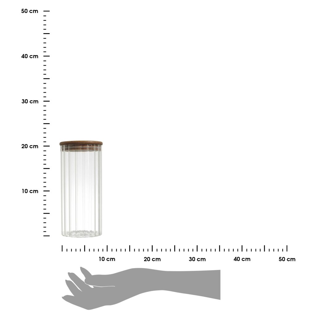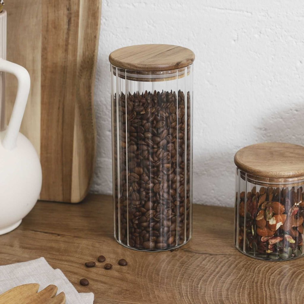 Poklice z akáciového dřeva dodává příjemný vizuální kontrast a zároveň spolehlivě těsní obsah nádoby , čímž chrání potraviny před vlhkostí. Nádoba je ideální pro skladování těstovin, kávy, sušenek, ořechů nebo jiných sypkých potravin . Díky svému vzhledu je nejen praktická, ale také stylovým doplňkem kuchyňské linky nebo otevřených polic .