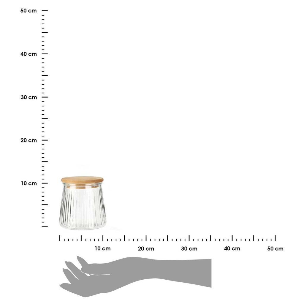 Kuchyňská nádoba vyznačující se harmonií elegance, funkčnosti a odolnosti. Tato praktická nádoba je nepostradatelným doplňkem každé kuchyně. Sklo je materiál bezpečný pro potraviny, neobsahuje škodlivé chemikálie, což umožňuje dlouhodobé uchování přirozené chuti a čerstvosti skladovaných výrobků. Nádoba má zajímavý vzhled. Sklo má svislé drážky, které dodávají celku elegantní charakter. Dřevěné víko dodává šarm a přirozenost. Víko nasazené na silikonovém kroužku poskytuje uloženým produktům ochranu před vzduchem, vlhkostí nebo prachem. Nádoba je vhodná pro skladování různých sypkých potravin, jako je mouka, cukr, snídaňové cereálie, pepř, těstoviny nebo sušenky.Doplňkové parametry