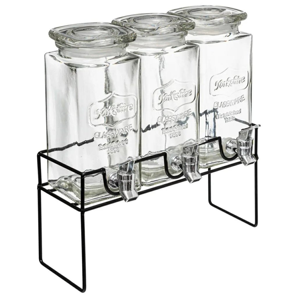 Skleněná nádoba na potraviny s kohoutkem Gilbert 1,5 l – sada 3 ks je praktický a elegantní set , ideální pro servírování nápojů během oslav, grilování či každodenního používání . Každá skleněná nádoba je vybavena těsnícím kohoutkem , který umožňuje pohodlné a hygienické nalévání limonád, šťáv nebo vody. Pevné čiré sklo s reliéfním nápisem dodává soupravě klasický a stylový vzhled . Kovový stojan zaručuje stabilitu a snadný přístup ke všem třem nádobám najednou. Díky kompaktní konstrukci se sada hodí jak do interiéru, tak pro venkovní použití. Jednoduché plnění a čištění dělají z tohoto setu ideální řešení pro milovníky funkčních a estetických doplňků do kuchyně nebo na stůl .