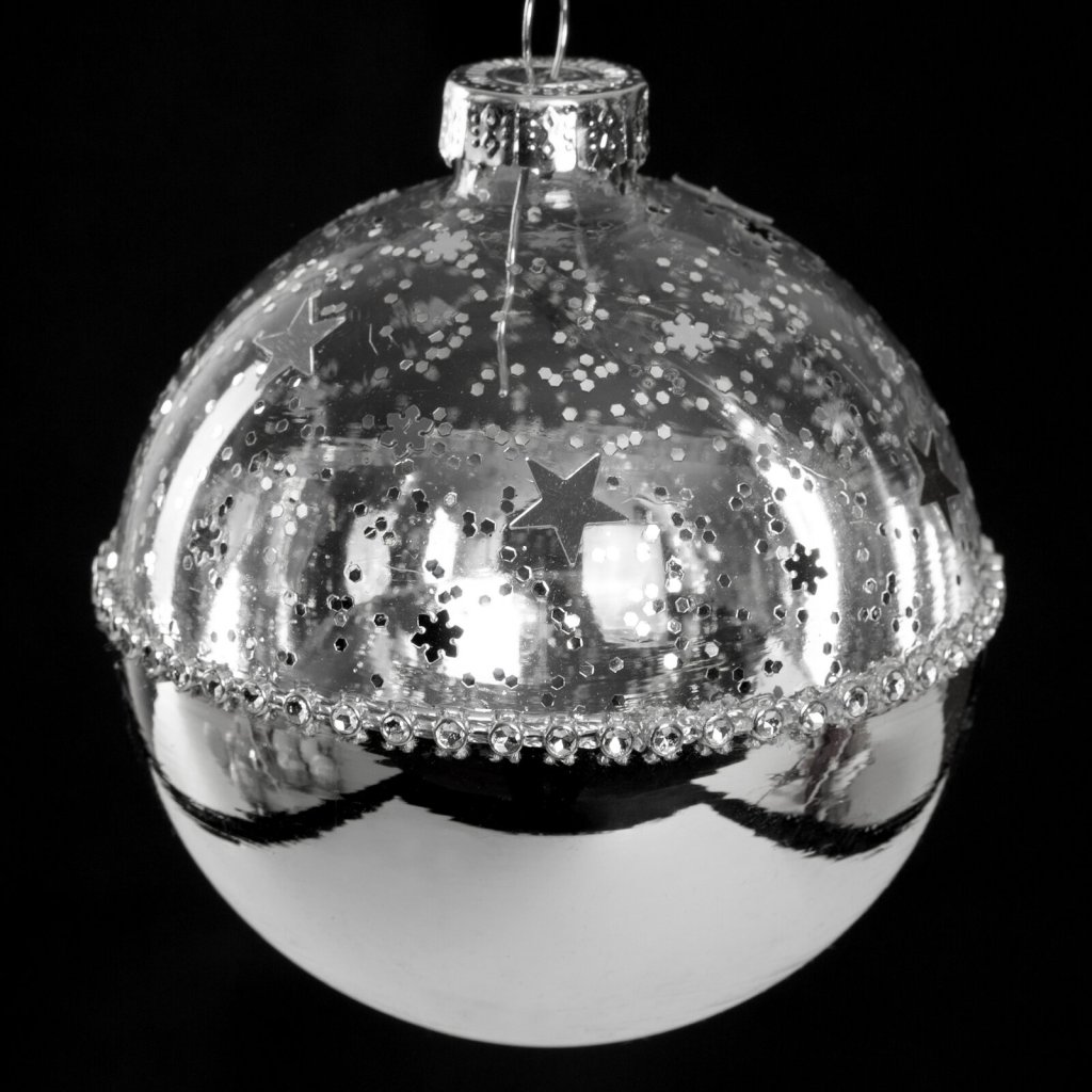 Skleněná vánoční koule je stylová dekorace, která vyniká originálním zpracováním. Horní část je zdobena třpytivými hvězdičkami a jemnými třpytkami, spodní část má elegantní stříbrný povrch. Díky tomuto kontrastu bude koule krásně zářit na vánočním stromku, v aranžmá nebo na věnci a dodá dekoraci luxusní nádech. Snadno ji zkombinujete s dalšími ozdobami ve stříbrné nebo kontrastní barevné paletě.Barva: stříbrná.