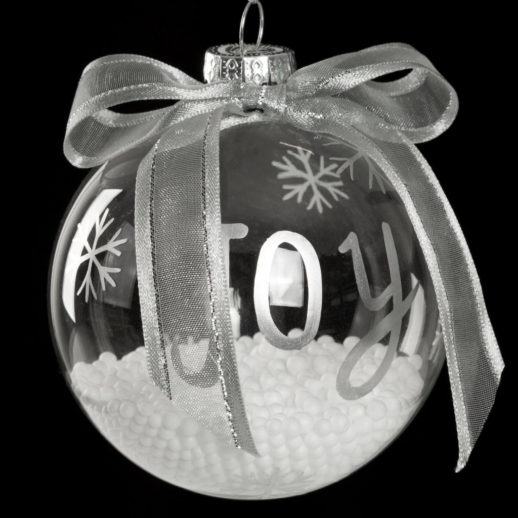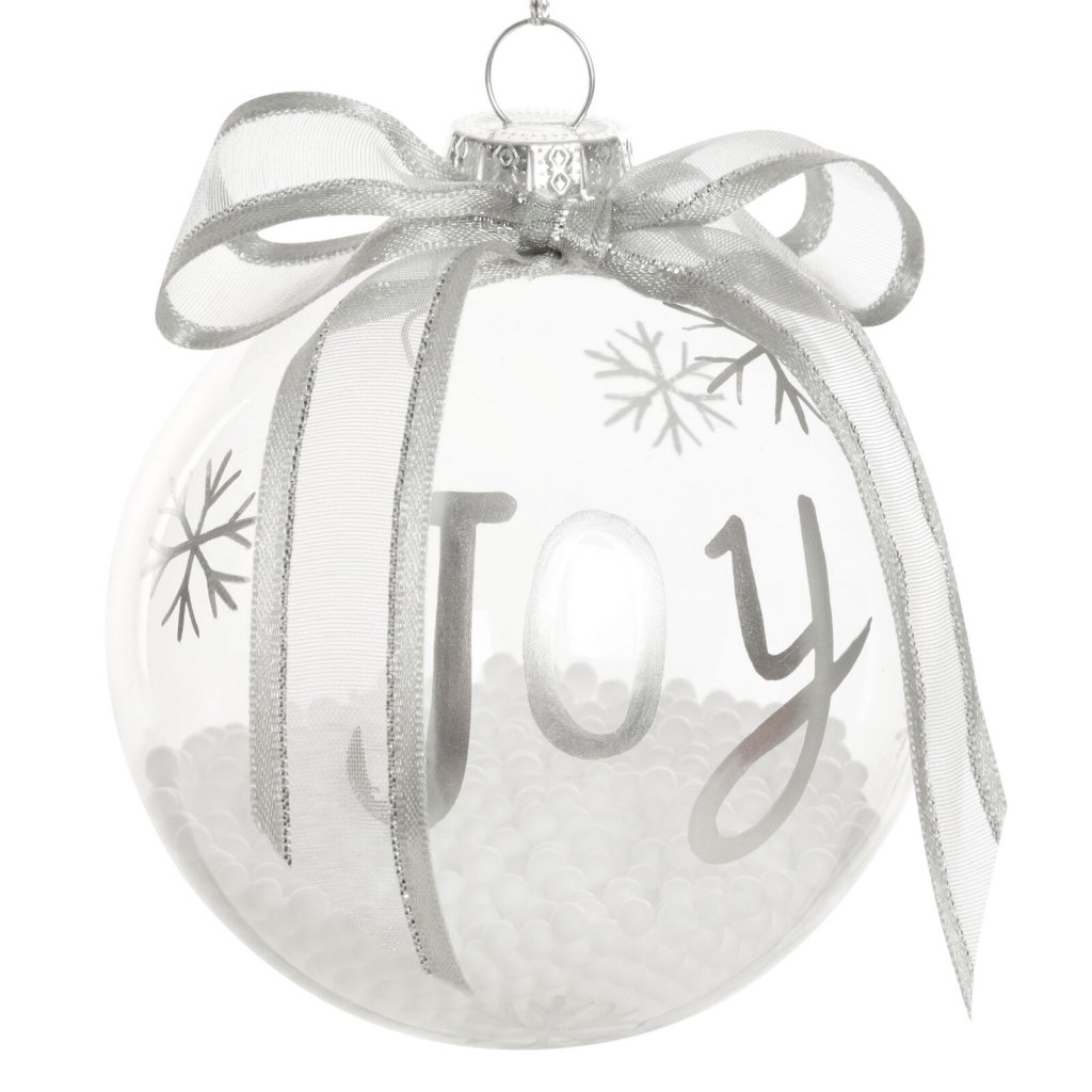 Průhledná koule je naplněna umělým sněhem v podobě drobných polystyrenových kuliček a ozdobena ručně vyrobeným nápisem Joy a jemnými sněhovými vločkami. Pečlivě zpracovaný vzor působí originálně a stylově.Klasická skleněná ozdoba se bude krásně vyjímat na tmavě zelených větvích vánočního stromku, ve věnci nebo aranžmá a dodá jim sváteční kouzlo.
