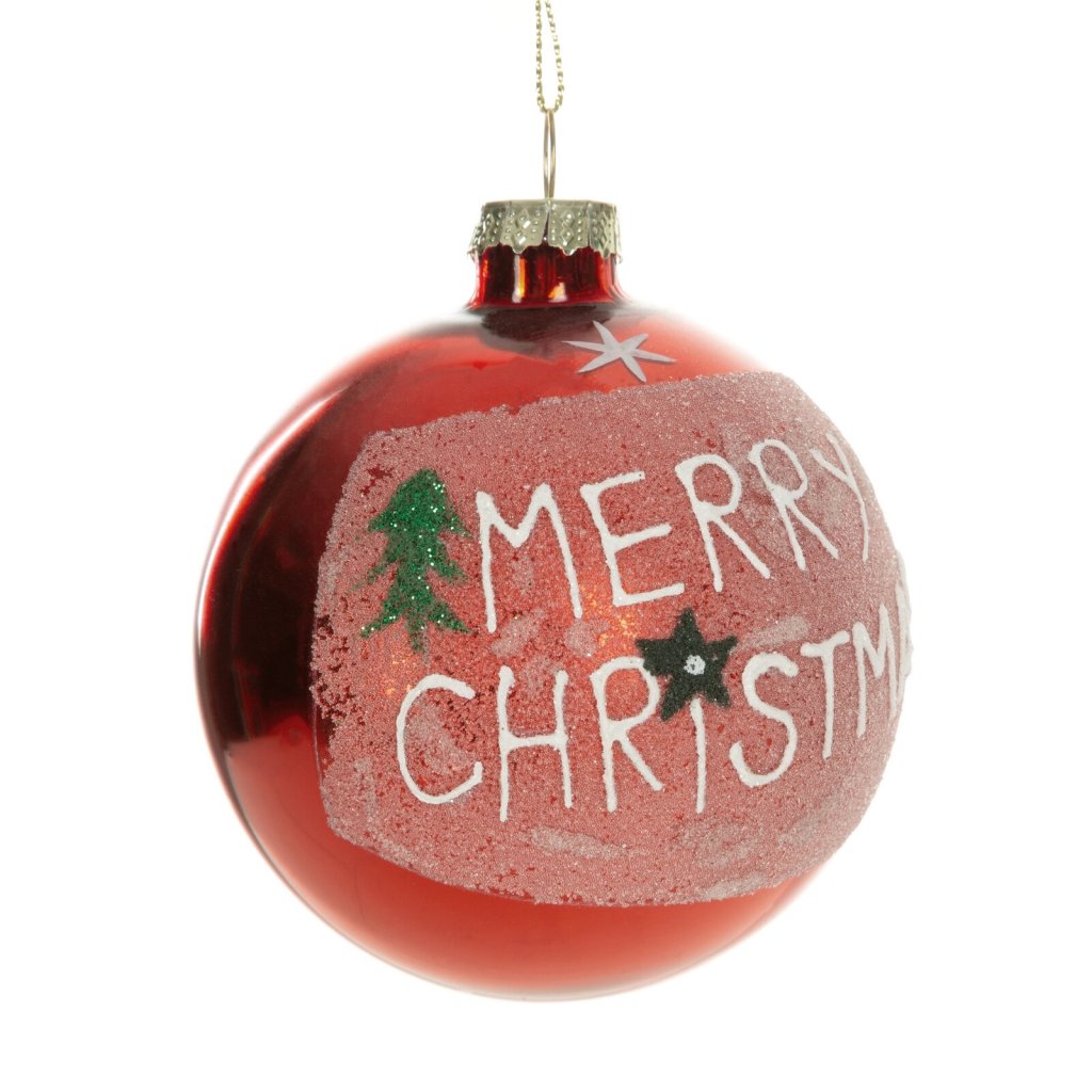 Skleněná vánoční koule v červené barvě je zdobena slavnostním nápisem, který byl nanesen ručně s důrazem na detail. Originální vzor dodává ozdobě jedinečný charakter a činí z ní výjimečný doplněk vánočních dekorací.Tato klasická skleněná koule se bude krásně vyjímat na tmavě zelených větvích stromku, vánočním věnci nebo v aranžmá. Skvěle se kombinuje s ostatními ozdobami v červené barevné paletě, ale také s kontrastními dekoracemi a vytváří tak harmonický a elegantní celek.