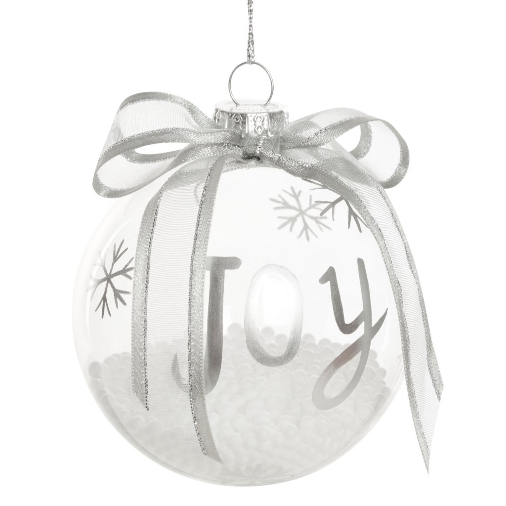 Průhledná koule je naplněna umělým sněhem v podobě drobných polystyrenových kuliček a ozdobena ručně vyrobeným nápisem Joy a jemnými sněhovými vločkami. Pečlivě zpracovaný vzor působí originálně a stylově.Klasická skleněná ozdoba se bude krásně vyjímat na tmavě zelených větvích vánočního stromku, ve věnci nebo aranžmá a dodá jim sváteční kouzlo.