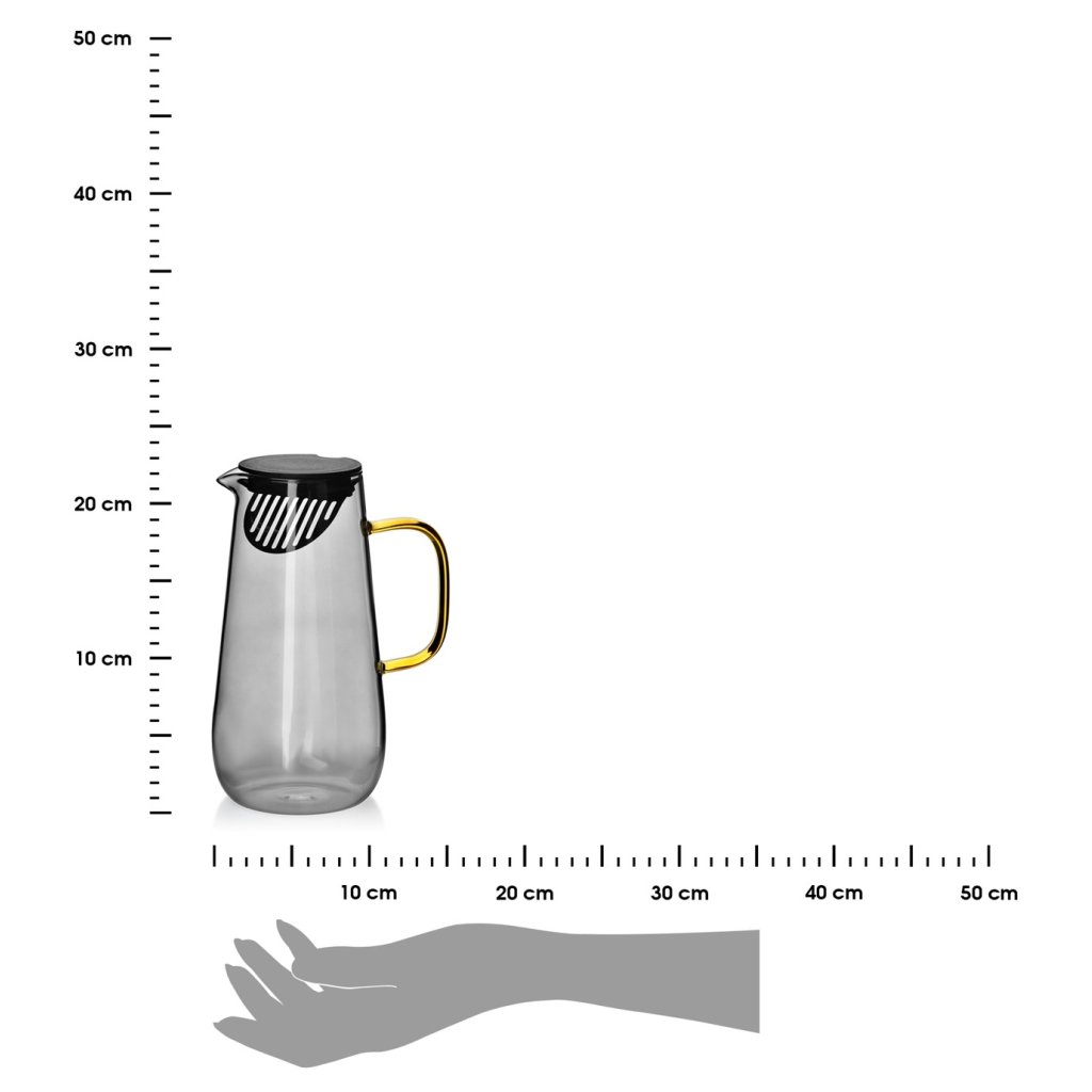 Elegantní džbán z kouřového skla je dokonalým spojením moderního designu a funkčnosti. Zlatá rukojeť mu dodává luxusní charakter a ergonomický tvar zajišťuje pohodlí při používání. Džbán má praktický filtr ve víku, který usnadňuje servírování nápojů s kousky ovoce nebo kostkami ledu, které zůstanou uvnitř. Vyrobený z kvalitního skla je ideální pro podávání studených i teplých nápojů. Džbán je díky svému minimalistickému a přitom elegantnímu vzhledu jedinečnou dekorací stolu a zároveň mimořádně praktickým prvkem každodenního používání.Doplňkové parametry