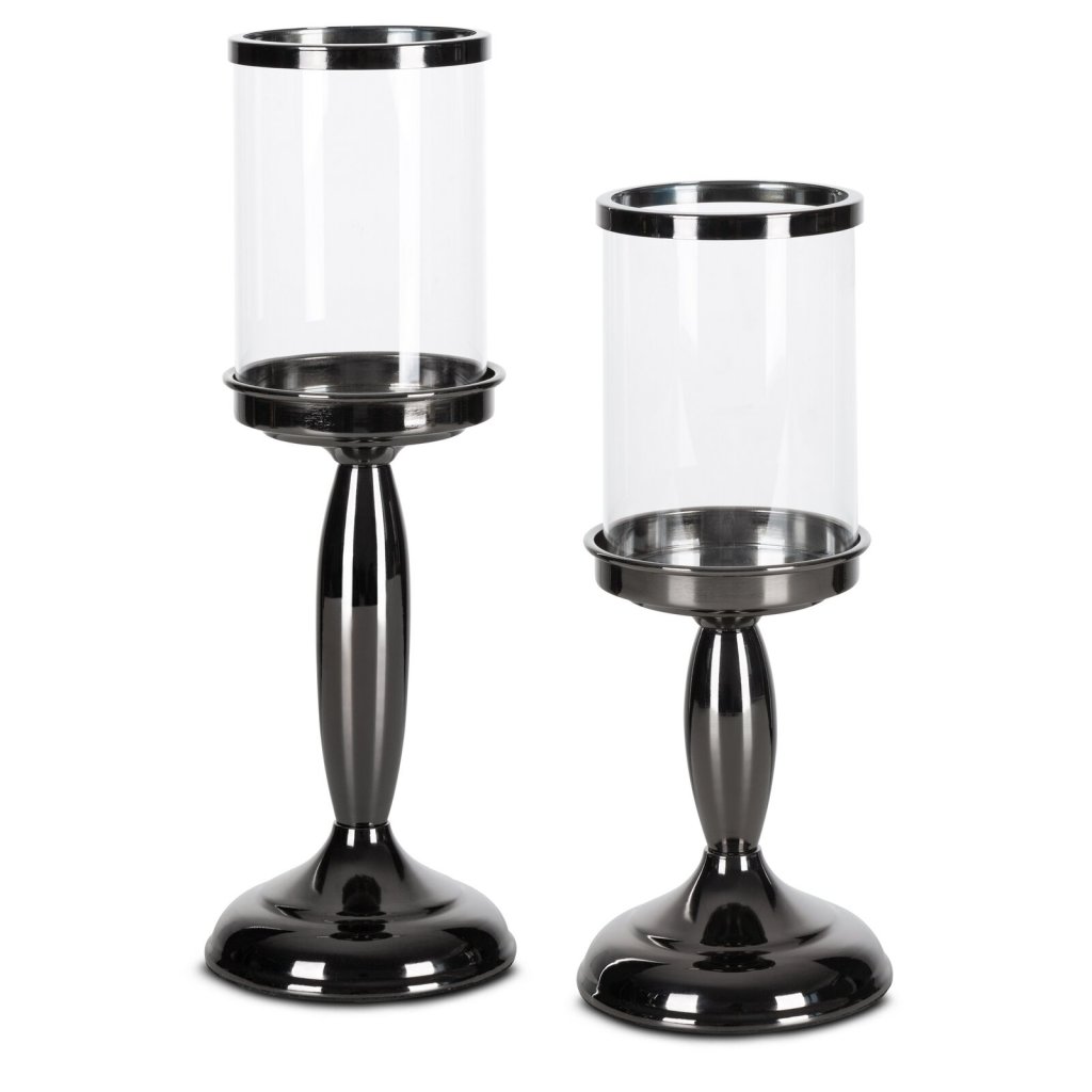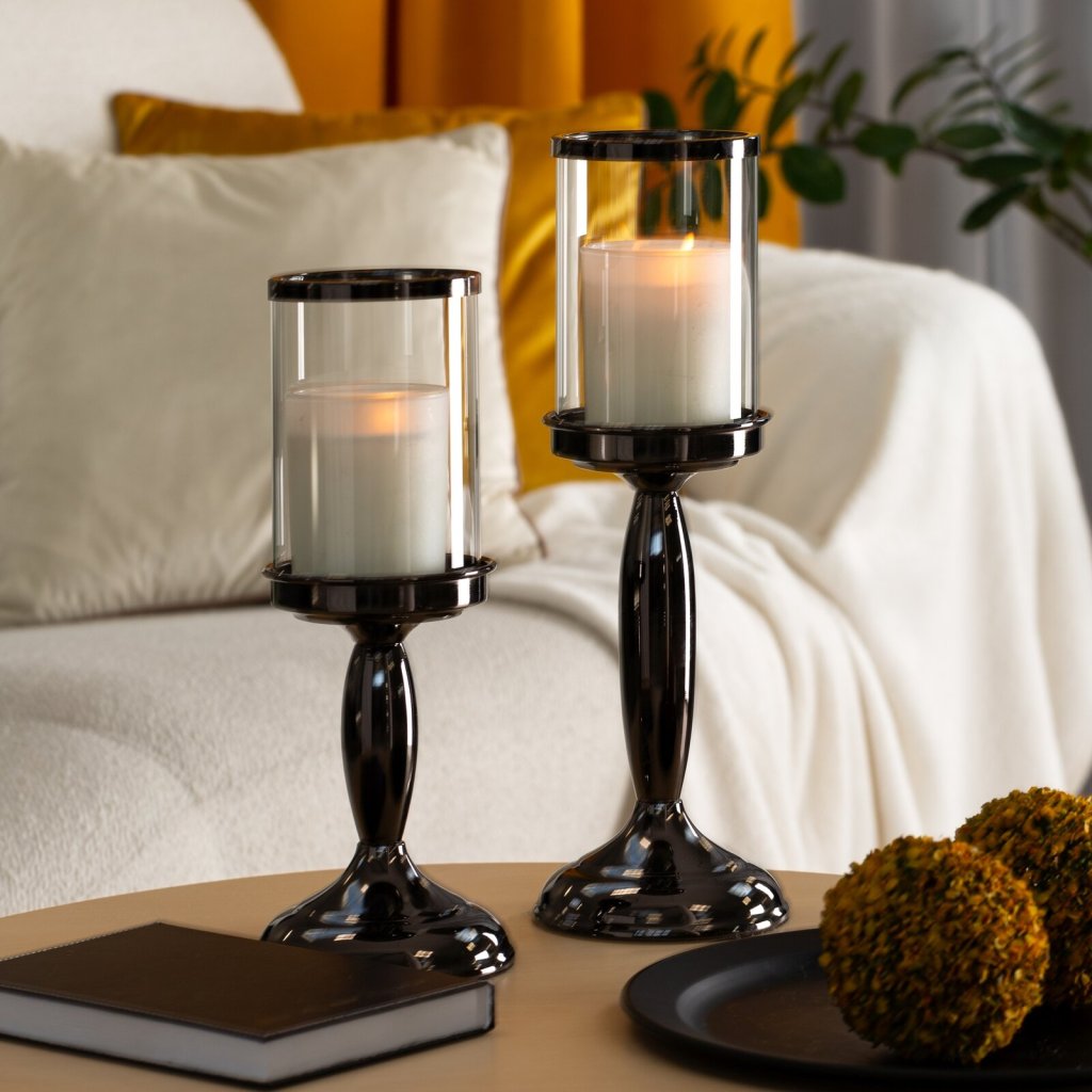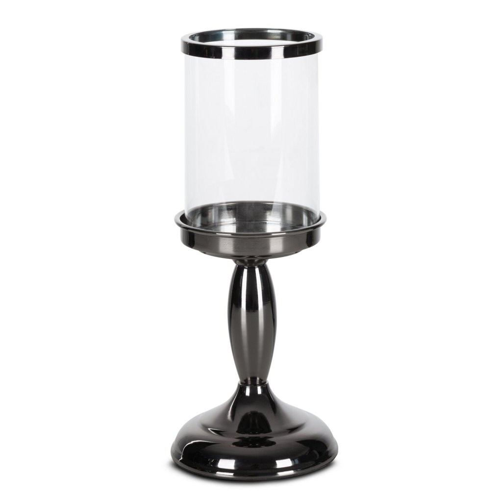 Dekorativní svícen, šířka: 13 cm, délka: 13 cm, výška: 18 cm, barva: černá, složení: kov, sklo.Doplňkové parametry