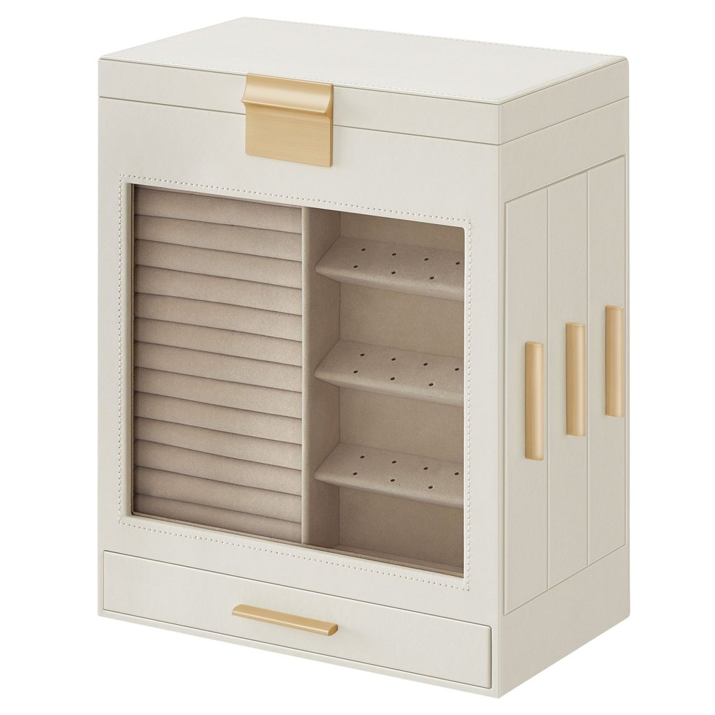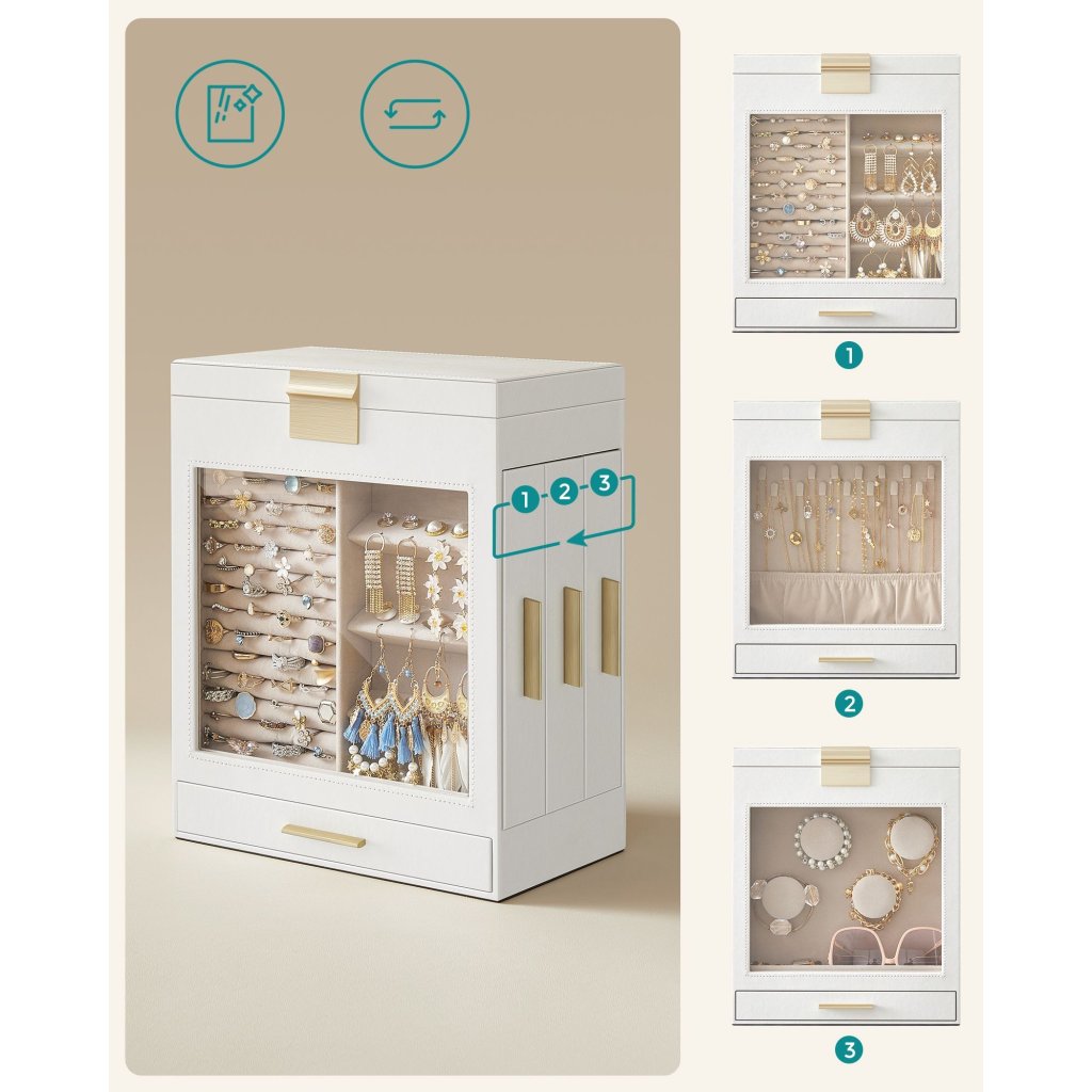 Šperkovnice Eleanor v elegantní bílé barvě je ideálním řešením pro všechny milovnice šperků, které hledají spojení praktičnosti a stylu. Díky rozměrům 15,5×26,1×32 cm nabízí dostatek prostoru a skvělou organizaci pro uložení prstenů, náušnic, náramků či hodinek .
