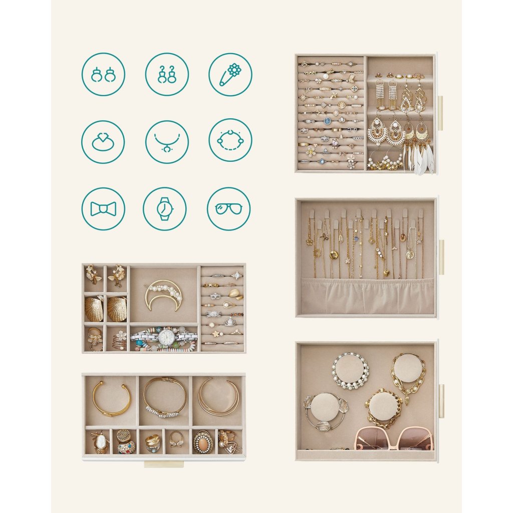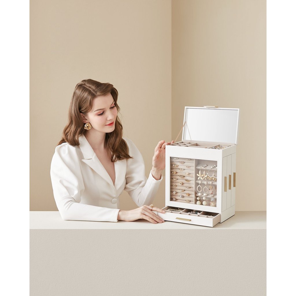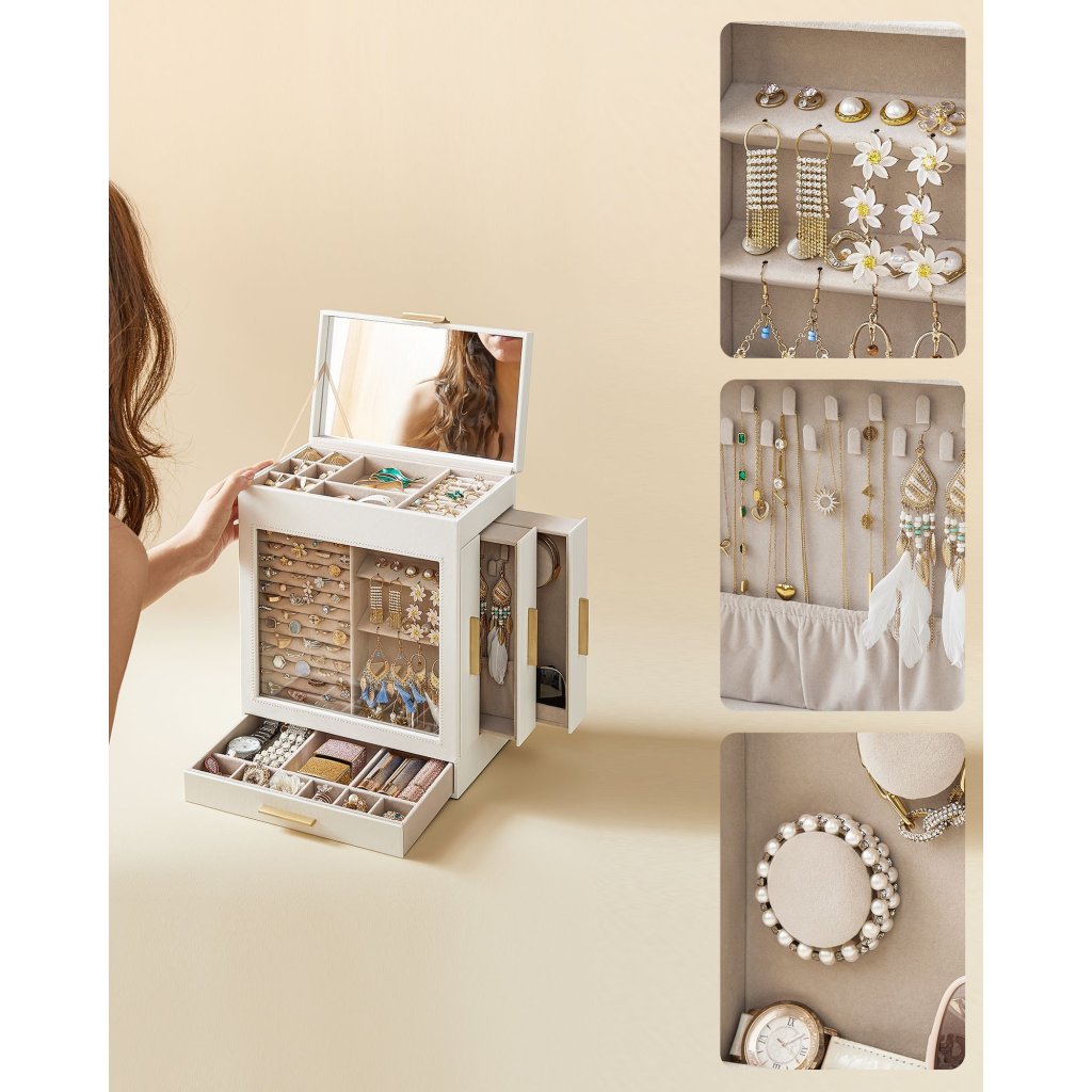 Model Eleanor disponuje pěti úložnými úrovněmi , z nichž horní část je vybavena vyjímatelnou přihrádkou se šesti komorami – ideální na větší šperky. Uvnitř se nachází také zabudované zrcadlo na vnitřní straně skleněné pokrývky, díky kterému si můžete okamžitě zkontrolovat výsledný vzhled. Design dotváří kombinace matné bílé barvy a kovových zlatých úchytek , která působí elegantně a moderně.