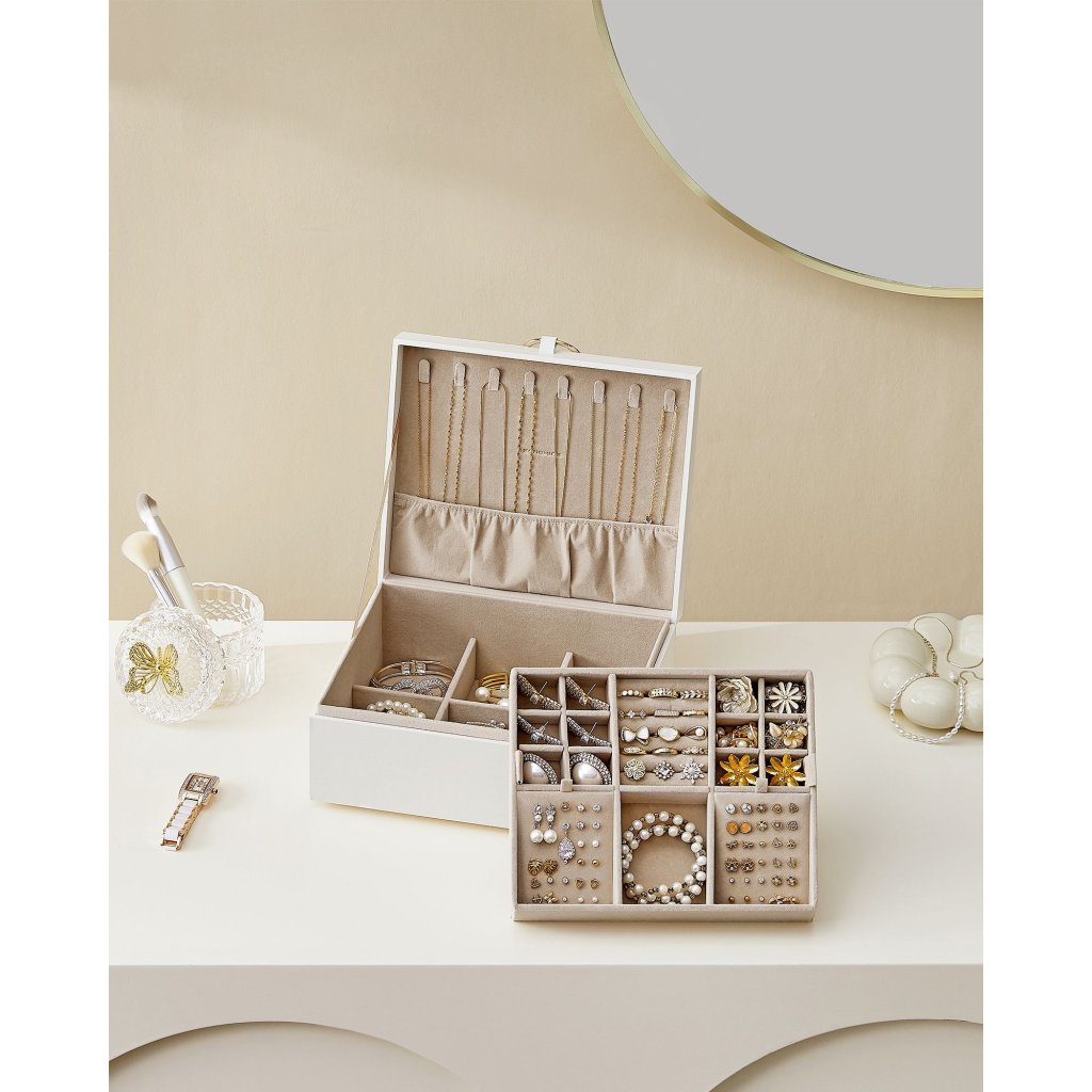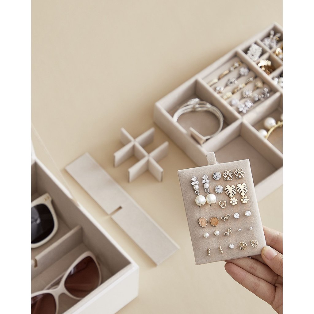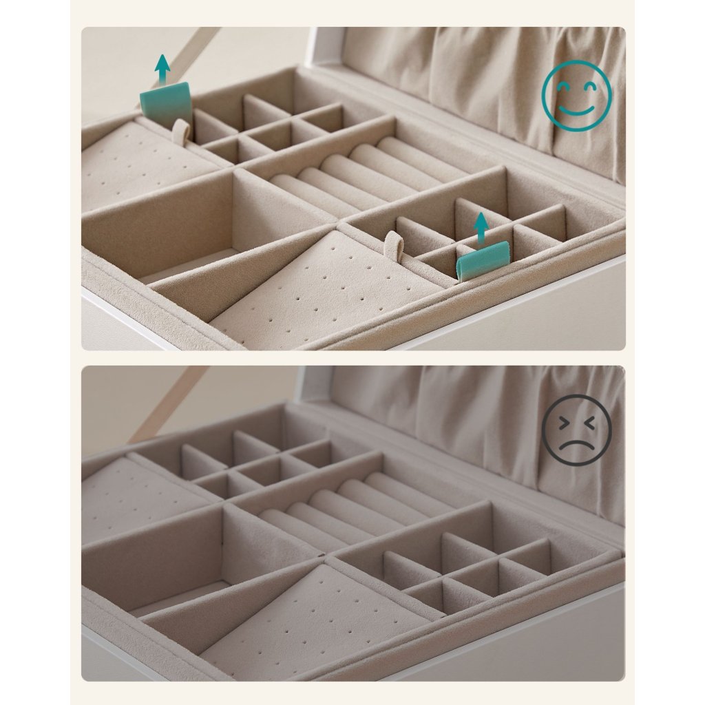 Různé velké přihrádky umožňují uložení náušnic, prstenů, hodinek či náramků , přičemž vyjímatelné segmenty poskytují flexibilitu – lze je přizpůsobit pro uchování větších kousků. Desky na náušnice lze umístit do vrchní i spodní části, případně i zvenčí, díky čemuž si interiér šperkovnice přizpůsobíte svým potřebám. Manipulaci s horní vrstvou usnadňují boční úchyty .