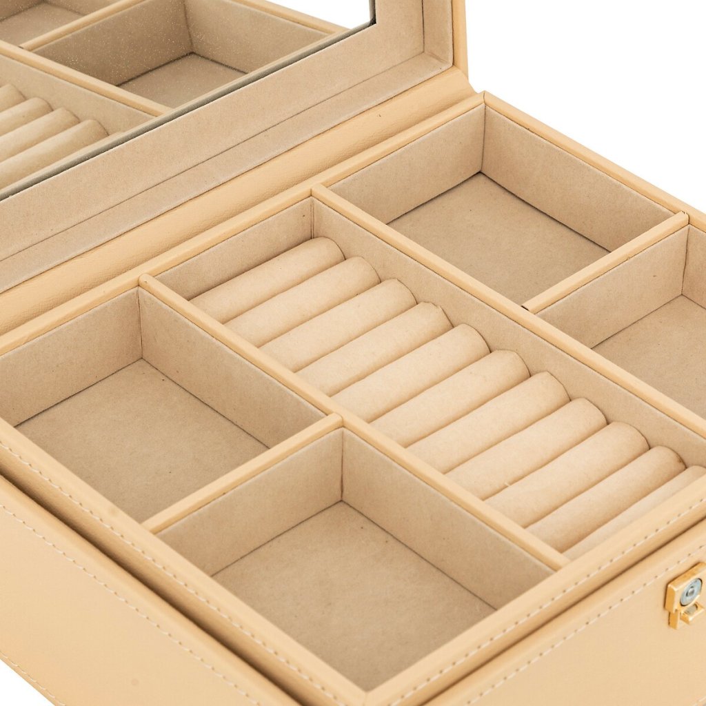 Šperkovnice Hanifa v elegantním béžovém provedení je ideálním řešením pro každého, kdo touží po přehledném a stylovém uspořádání své bižuterie. Toto sofistikované úložné řešení nejen ochrání tvé cennosti, ale zároveň se stane vkusným doplňkem interiéru ložnice či šatníku.