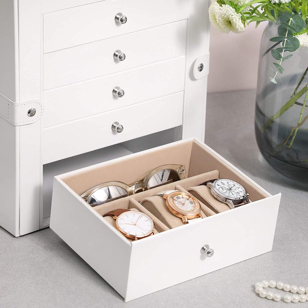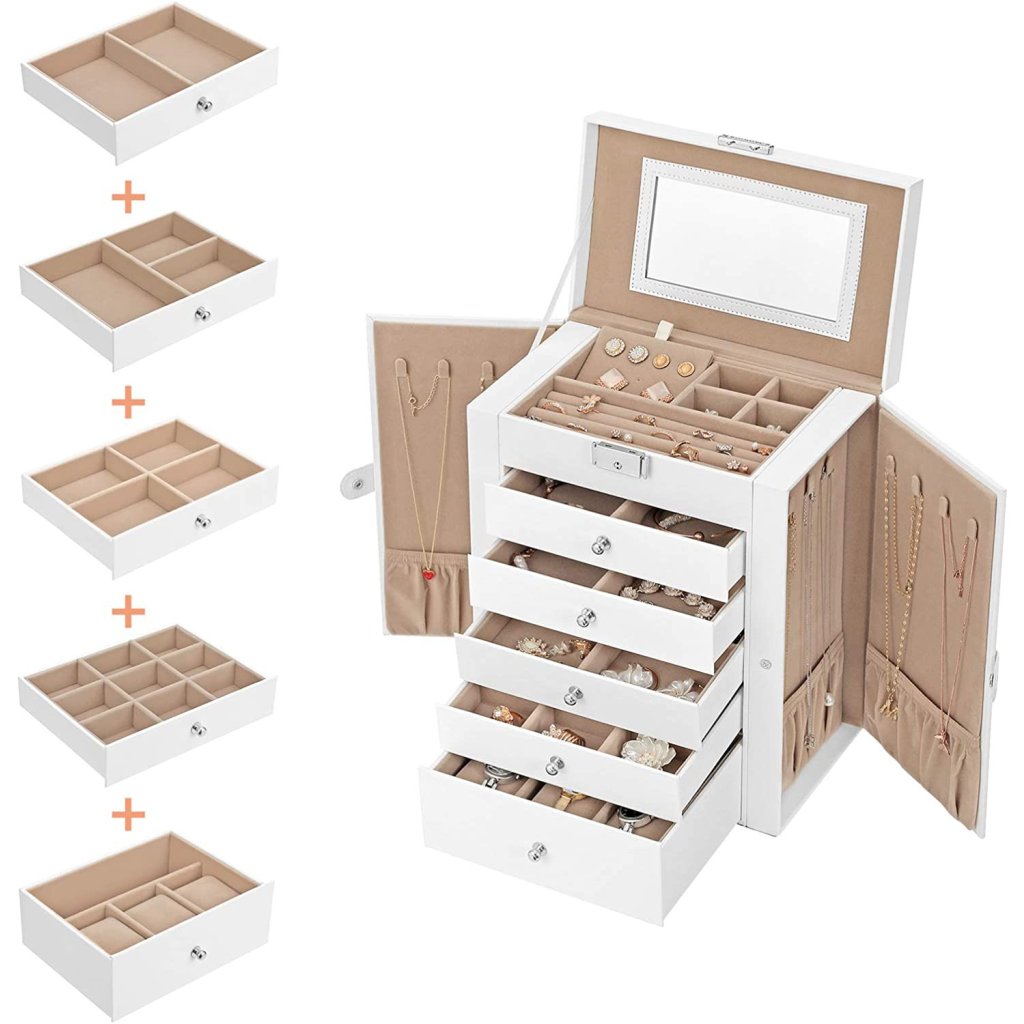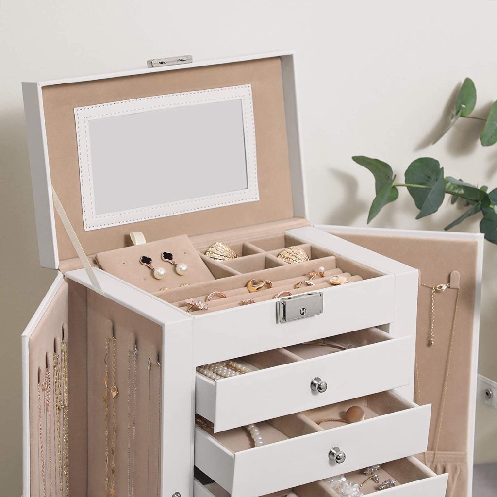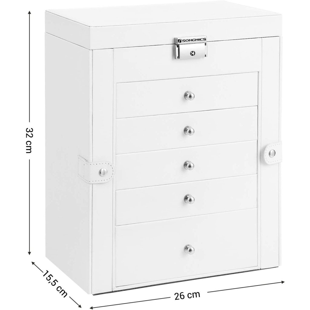 Šperkovnice Livia2 v elegantní bílé barvě je ideálním řešením pro všechny, kteří touží po dokonale zorganizované sbírce šperků. Díky šesti patrům úložného prostoru a dvěma výklopným bočním dvířkům nabízí dostatek místa pro všechny tvé doplňky , od náhrdelníků, náramků a náušnic, až po prsteny, hodinky a další osobní cennosti.