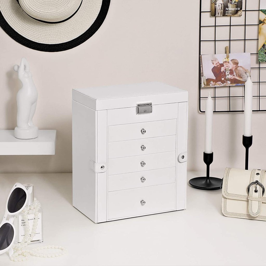 Vše, co potřebuješ k doplnění outfitu, bude vždy po ruce a přehledně uloženo , takže se vyhneš rannímu hledání oblíbených kousků. Jednoduchý design, nadčasová bílá barva a lesklé kovové úchyty působí stylově a jemně zároveň , díky čemuž se šperkovnice stane nejen praktickým pomocníkem, ale také ozdobou tvého interiéru.