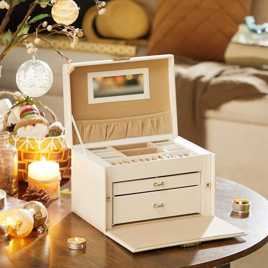 Máte pocit, že se vám řetízky neustále zamotávají a prsteny se ztrácejí po bytě? Elegantní šperkovnice Esther vám pomůže udržet pořádek ve špercích a zároveň je bezpečně uskladnit. Rozměry hlavní šperkovnice jsou 18 × 26 × 17 cm a přenosná mini šperkovnice , která je součástí balení, má rozměr 14 × 9 × 3,5 cm , což z ní činí ideálního společníka na cesty.