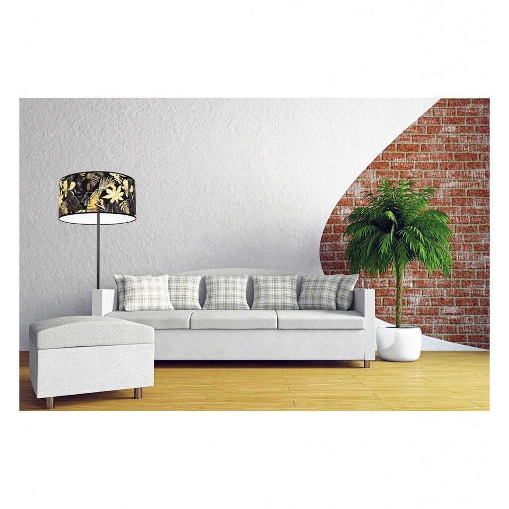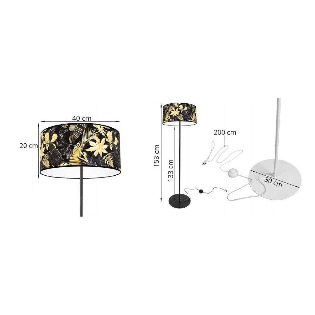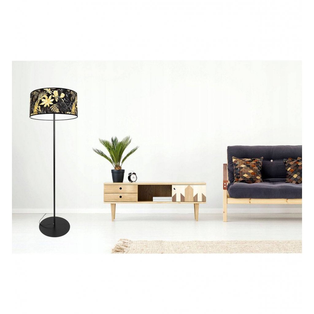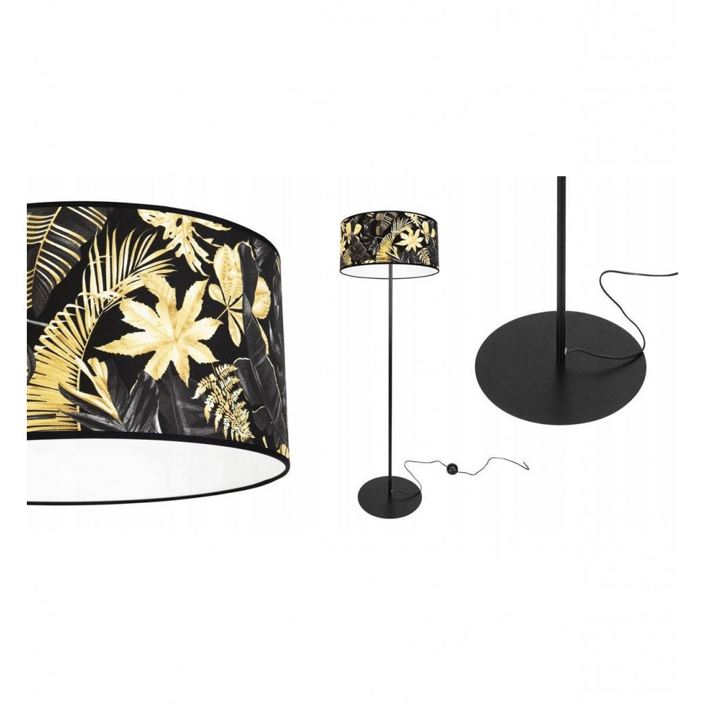Stojací lampa Gold Flowers, 1x černé textilní stínítko s květinovým vzorem, (fi 40cm),
