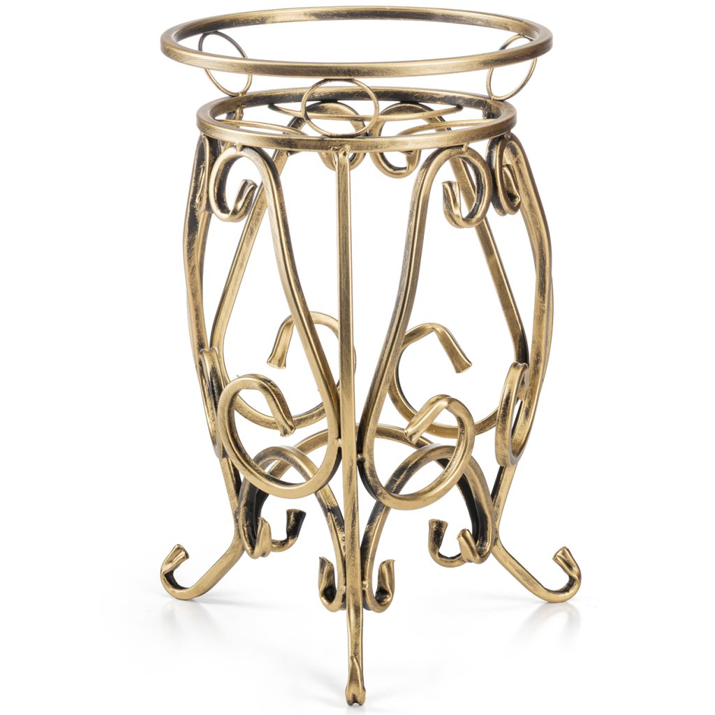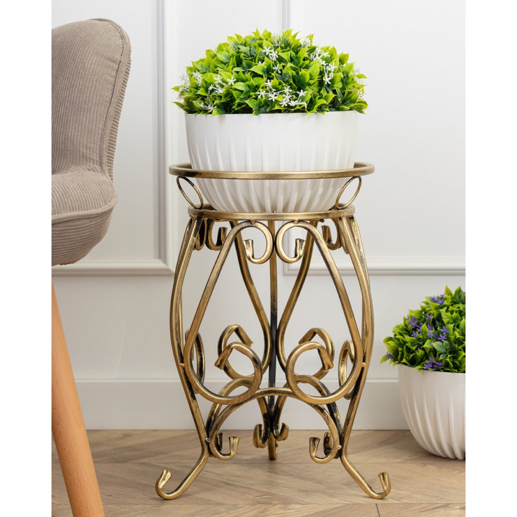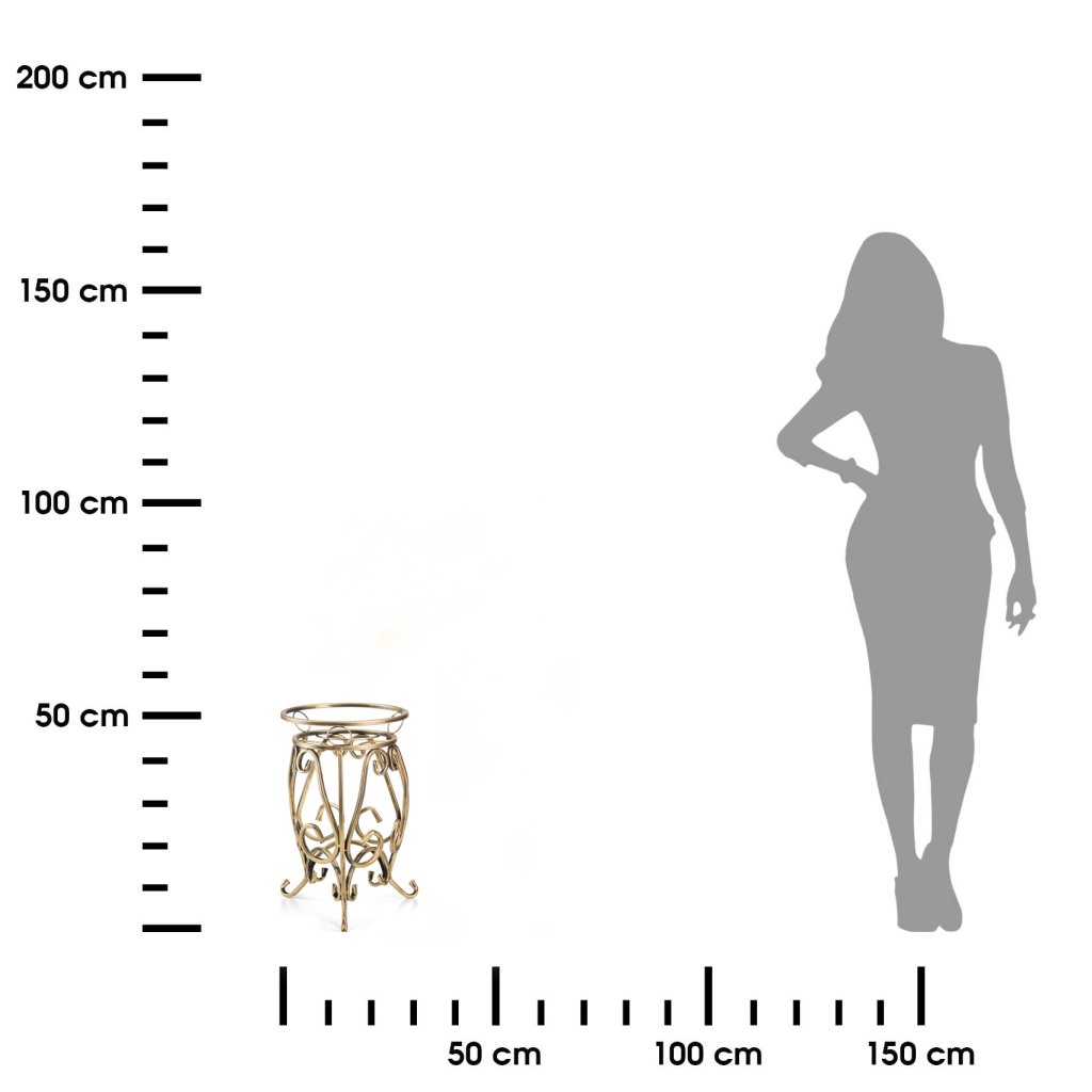 Ručně vyrobený stojan je zdoben jemnou patinou, která podtrhuje zlatý odstín a vytváří harmonický kontrast s přirozenou zelenou rostlin. Díky svému univerzálnímu vzhledu se hodí do klasických i moderních interiérů a může sloužit i jako dekorace do exteriéru . Výrazné kovové detaily dodávají stojanu osobitý charakter a dělají z něj výjimečný bytový doplněk . Rozměry stojanu na květináč jsou přibližně 44,5 × 31 × 28 cm. Vnitřní průměr místa pro umístění květináče je u základny přibližně 20,5 cm a při horním okraji přibližně 26 cm. Vzhledem k ručnímu zpracování se mohou rozměry mírně lišit přibližně o 3 až 5 cm. Balení obsahuje pouze stojan bez květináčů .