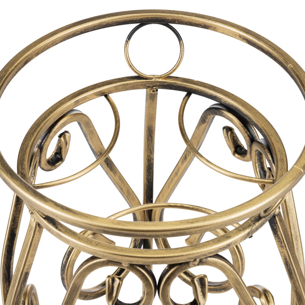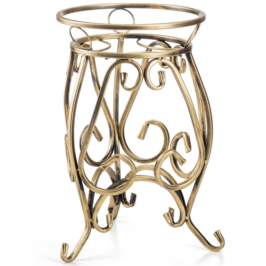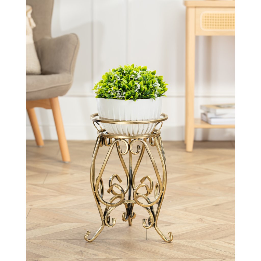 Ručně vyrobený stojan je zdoben jemnou patinou, která podtrhuje zlatý odstín a vytváří harmonický kontrast s přirozenou zelenou rostlin. Díky svému univerzálnímu vzhledu se hodí do klasických i moderních interiérů a může sloužit i jako dekorace do exteriéru . Výrazné kovové detaily dodávají stojanu osobitý charakter a dělají z něj výjimečný bytový doplněk . Rozměry stojanu na květináč jsou přibližně 44,5 × 31 × 28 cm. Vnitřní průměr místa pro umístění květináče je u základny přibližně 20,5 cm a při horním okraji přibližně 26 cm. Vzhledem k ručnímu zpracování se mohou rozměry mírně lišit přibližně o 3 až 5 cm. Balení obsahuje pouze stojan bez květináčů .