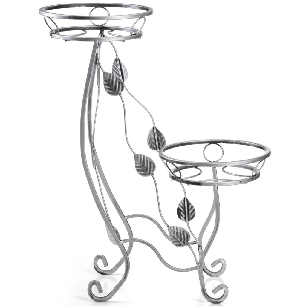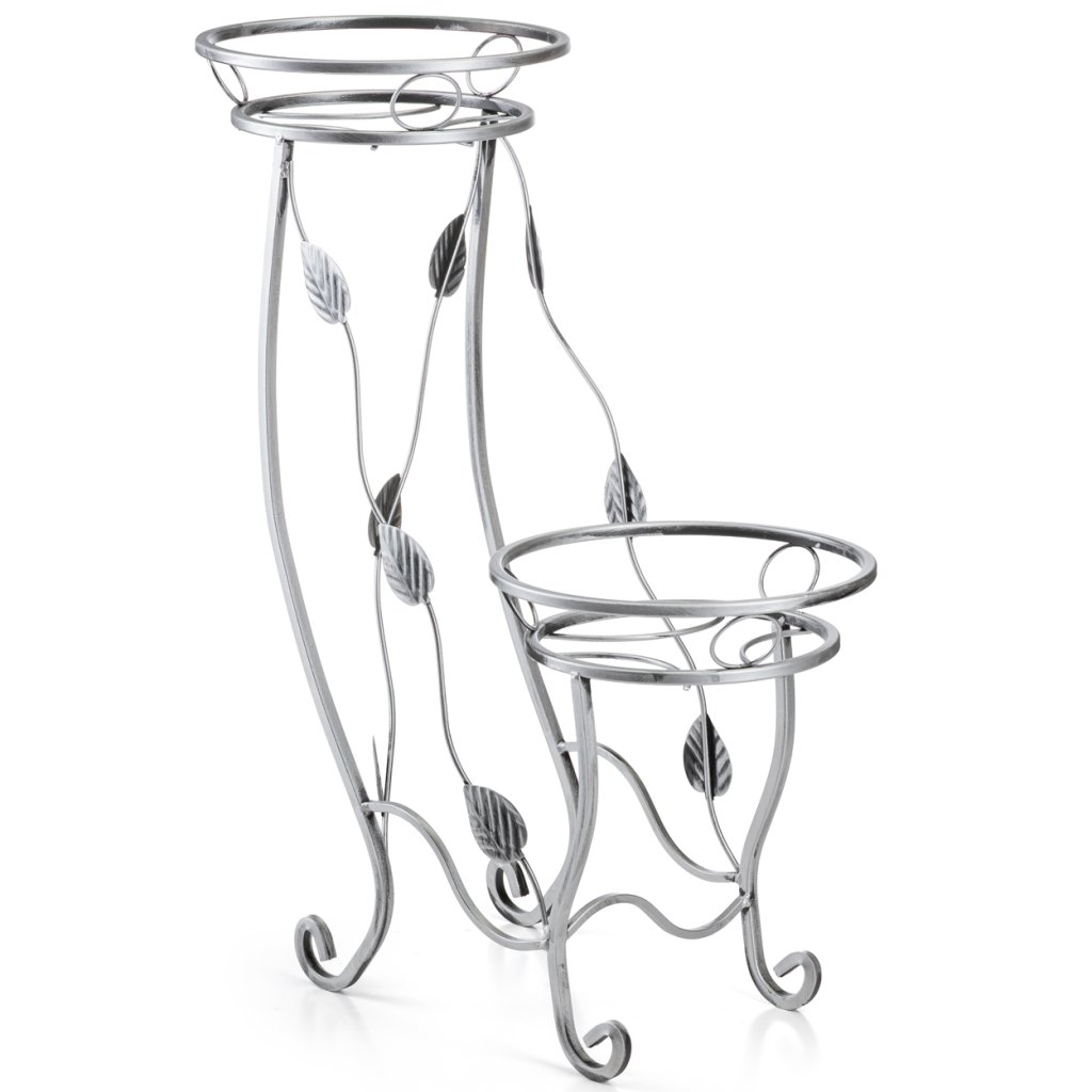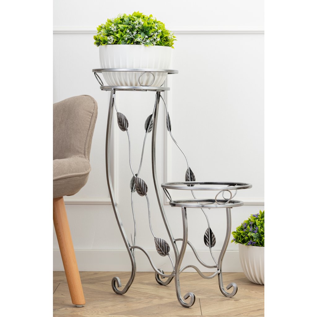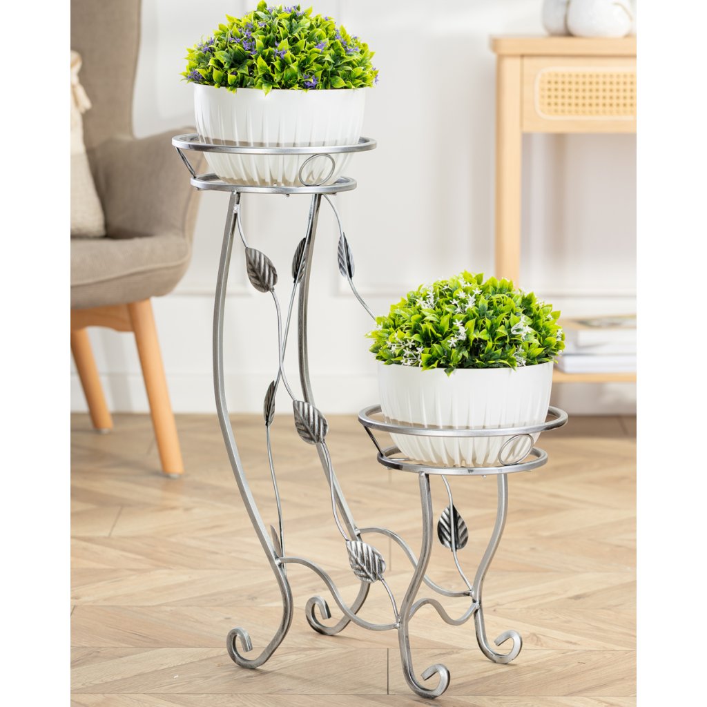 Kovový stojan na květináče Julyan ve stříbrné patině představuje ideální volbu pro ty, kteří vyhledávají moderní, ale zároveň stylová řešení při zařizování interiérů nebo exteriérů. Tento elegantní a odolný model je určen na dvě květináče a díky rozdílné výšce jednotlivých úchytů umožňuje vytvořit zajímavou prostorovou kompozici , která oživí každý prostor.