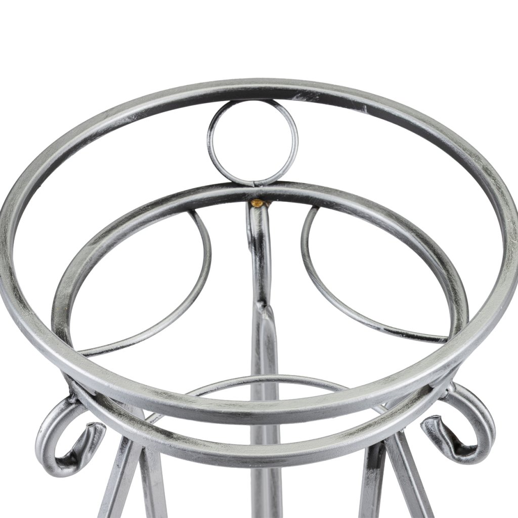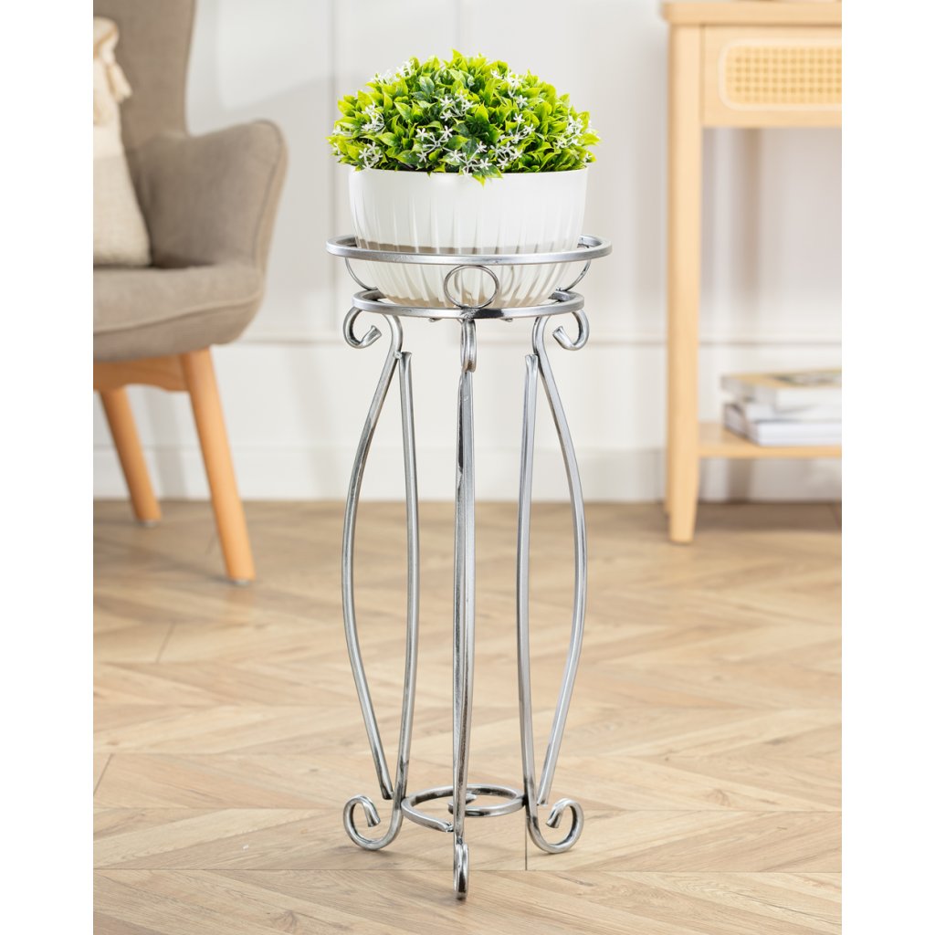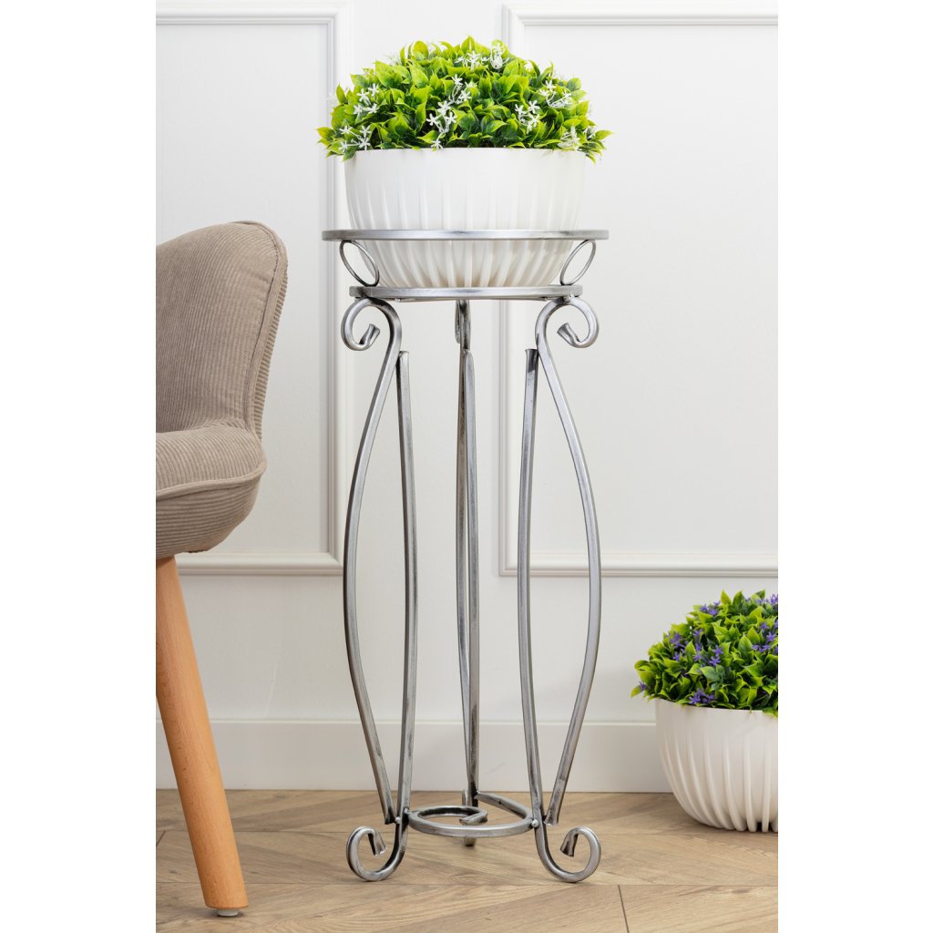 Stříbrná patina v jemně přebroušeném provedení podtrhuje umělecký vzhled kovové konstrukce, přičemž minimalistický design stojanu harmonicky doplňuje jak moderní, tak rustikální prostory. Výška podstavce pod květináč je přibližně 7 cm, což umožňuje stabilní uložení rostliny.