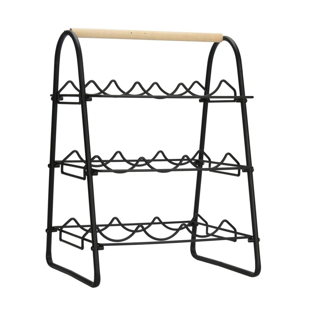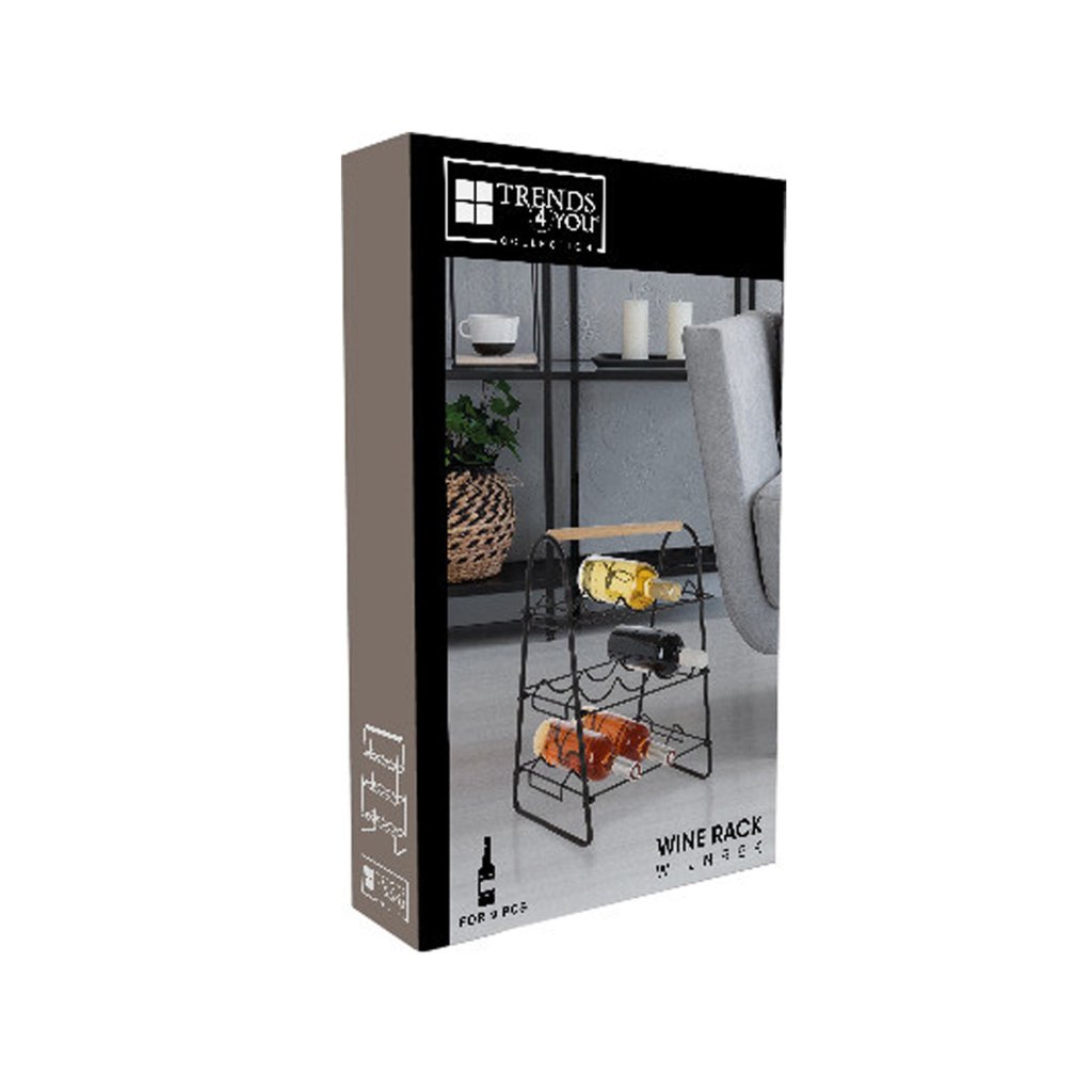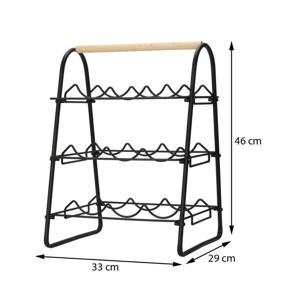 Industriální stojan s prostorem pro 9 lahví vašeho oblíbeného nápoje. Pevná police vyrobená z kovu, vybavená dřevěnou rukojetí pro snadné přenášení. Pevná konstrukce a zajímavý design dělají ze stojanu nejen praktický, ale také výrazný dekorativní prvek. Stojan dobře poslouží v kuchyni, jídelně, ale také v restauracích či hospodách.Doplňkové parametry