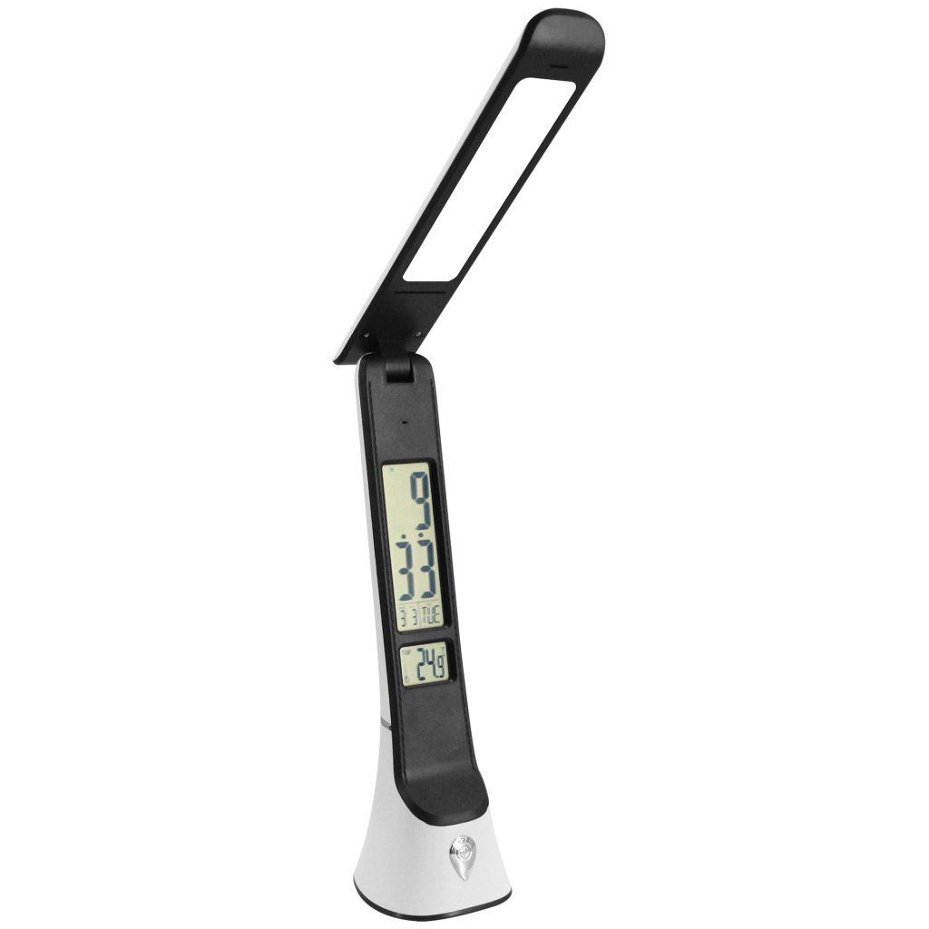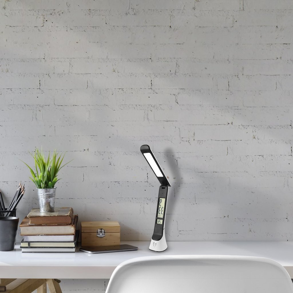 Výklopné rameno umožňuje kompaktní složení lampy, což oceníte zejména při přenášení nebo při cestování. Po rozložení se pod ramenem nachází světelný zdroj. Dotykové ovládání je doplněno o elektronický displej se zobrazením času, data a aktuální teploty , díky čemuž se stává i funkčním doplňkem pracovního prostoru.