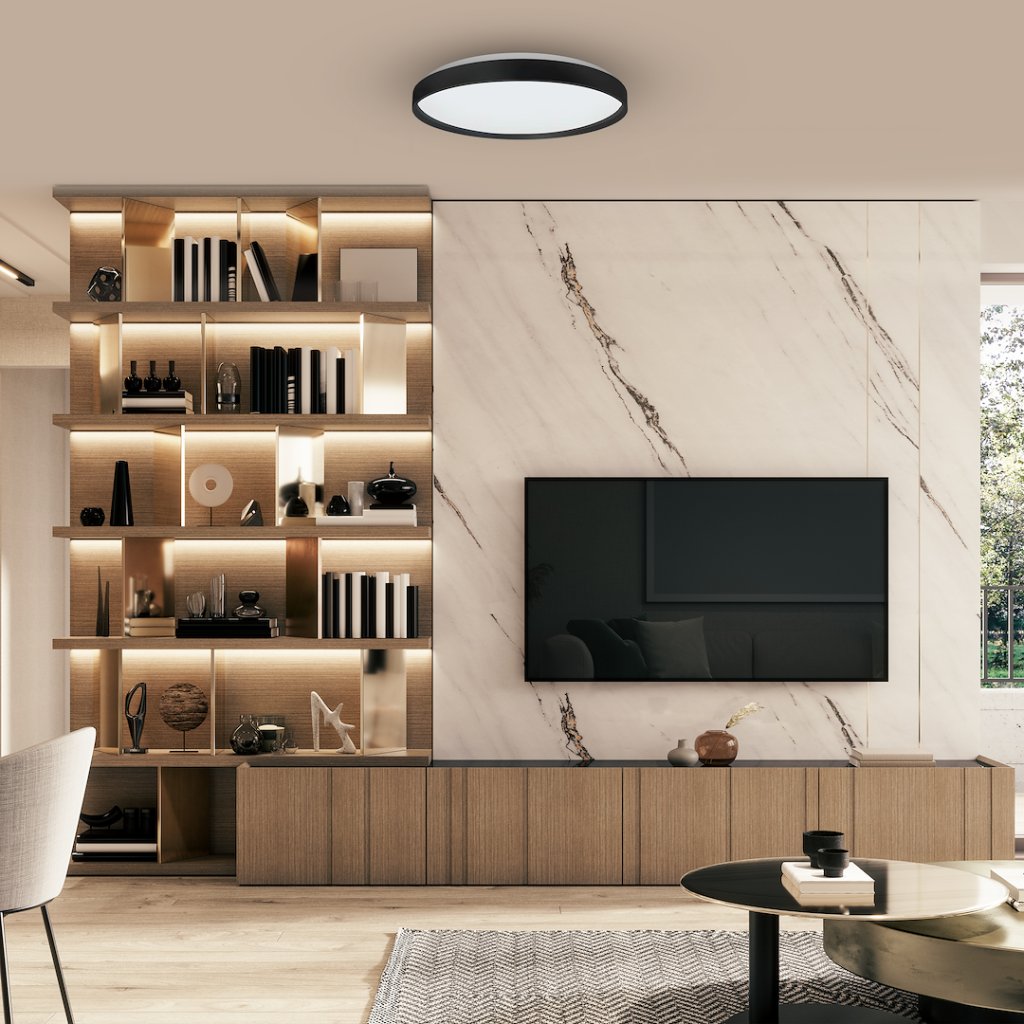 Stropní LED svítilna z kolekce RINGO RGB je skvělou volbou pro ty, kteří hledají osvětlení s vizuálním efektem a možností barevné personalizace . Model o průměru 39 cm spojuje moderní design s technologií, která mění běžné svícení na atmosférický zážitek .