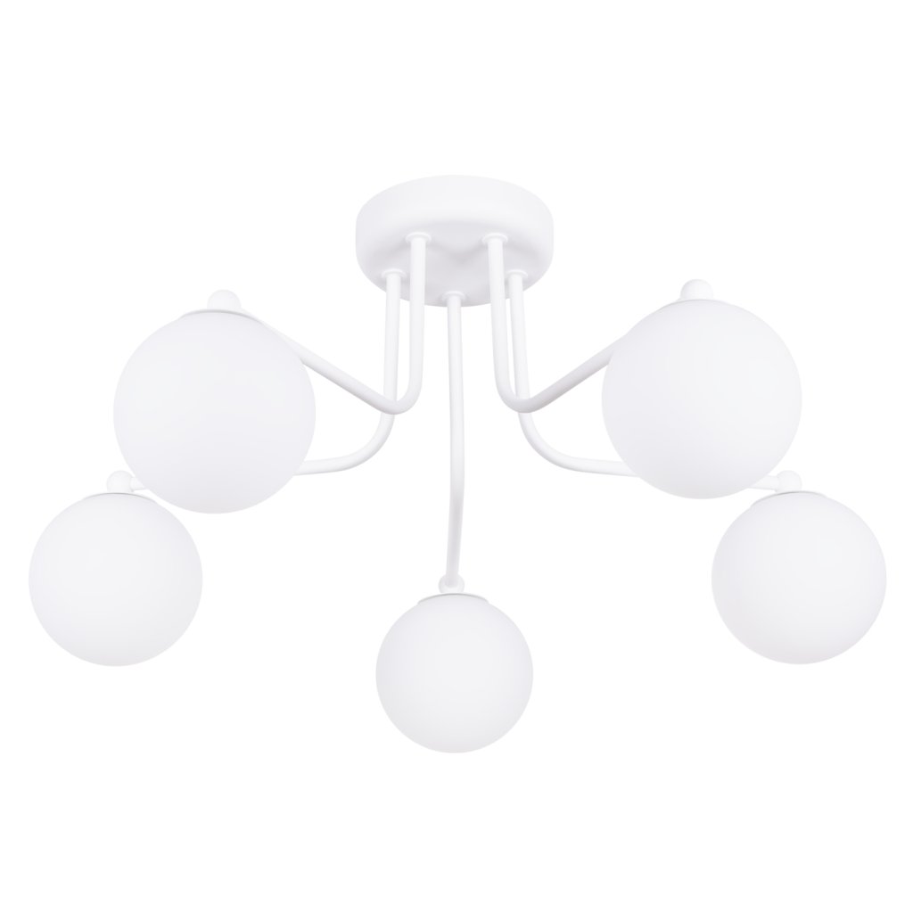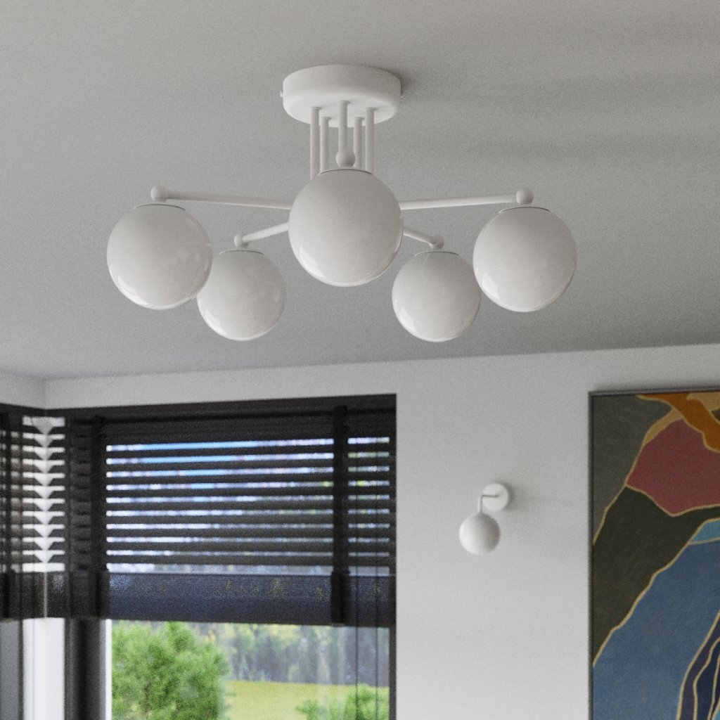 Stropní svítidlo ASTRAL s pěti bílými skleněnými stínidly je elegantní řešení osvětlení, které kombinuje moderní design s klasickou estetikou. Jednoduchá kovová konstrukce v bílé barvě působí čistě a decentně, zatímco matná kulovitá stínidla dodávají svítidlu charakter a vytvářejí harmonický vizuální dojem. Tento model se dokonale hodí do moderních i tradičních interiérů, kde vynikne svou nadčasovou jednoduchostí.