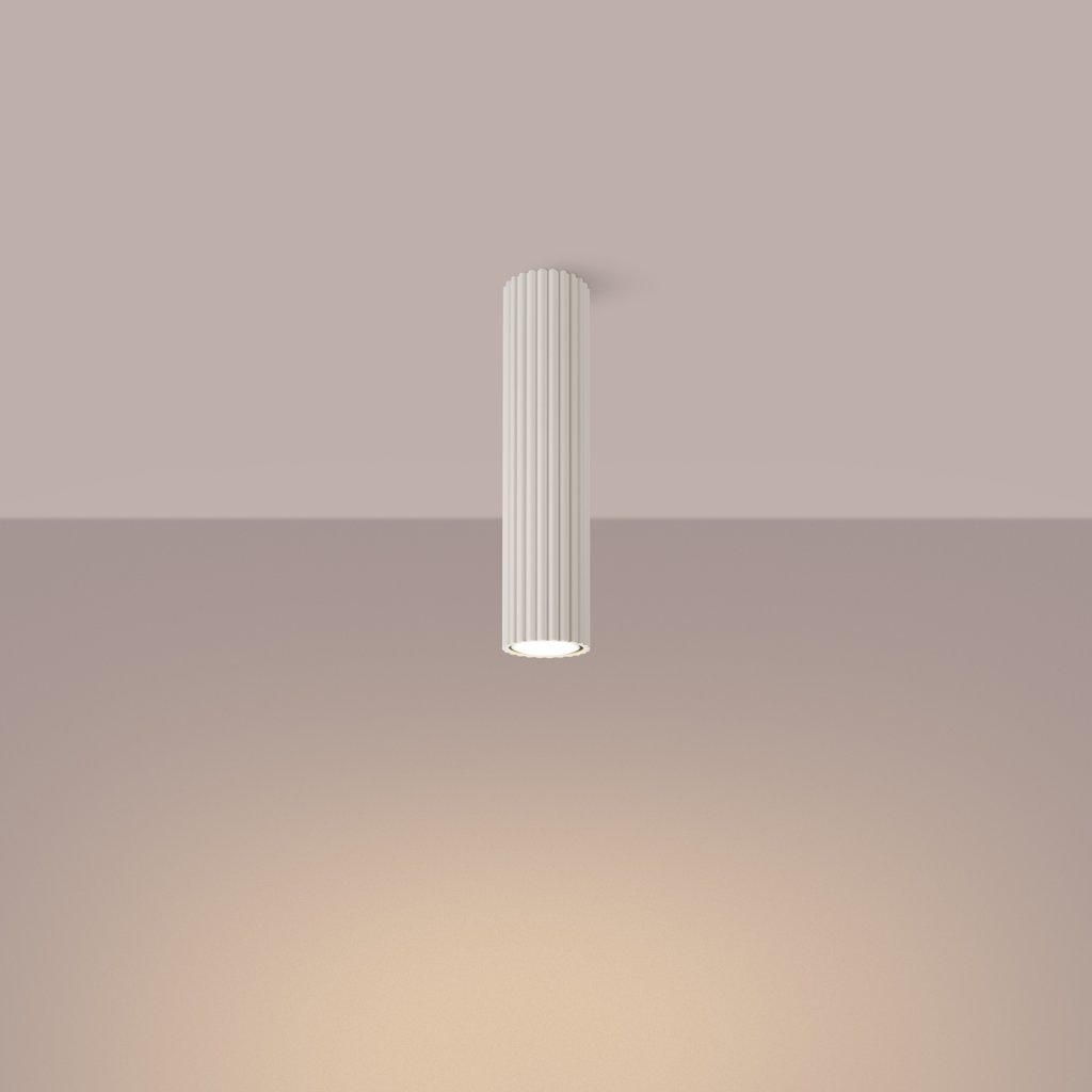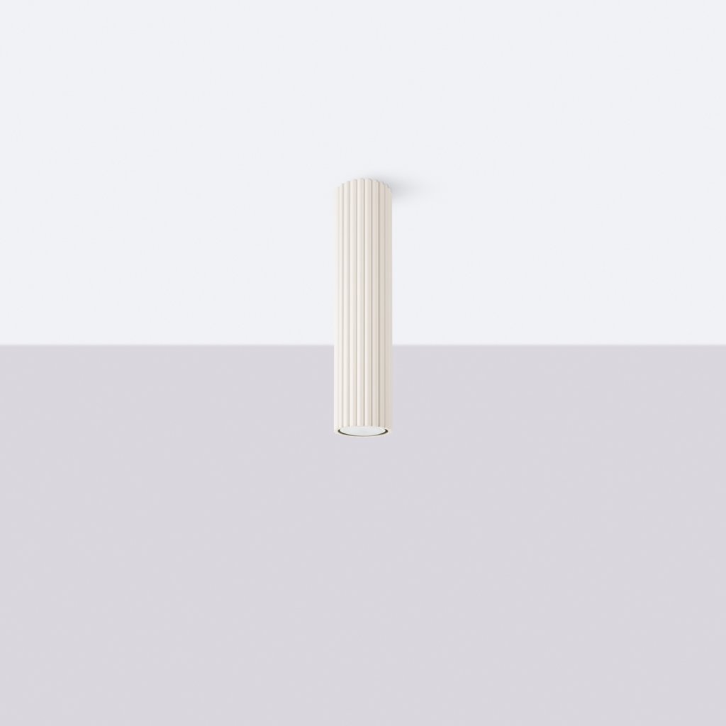 Stropní svítidlo KARBON s jedním béžovým kovovým stínidlem o délce 30 cm zaujme svou jednoduchostí a vkusnou elegancí. Válcový tvar s jemným žebrovaným povrchem dodává svítidlu charakter a optickou lehkost, díky čemuž se stane nenápadným, ale výrazným doplňkem moderních interiérů. Béžová barva působí přirozeně a vnáší do prostoru teplo a vizuální rovnováhu.