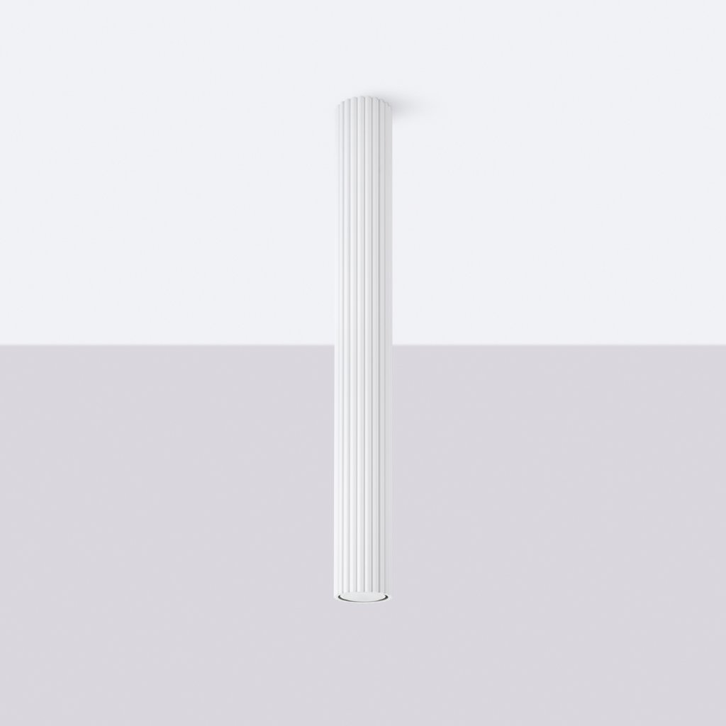 Stropní svítidlo KARBON s bílým kovovým stínidlem v délce 60 cm je elegantní řešení osvětlení, které v sobě spojuje moderní design a praktičnost. Minimalistické linie, žebrovaný povrch a matná bílá barva vytvářejí nenápadný, a přesto výrazný prvek vhodný do každého interiéru.