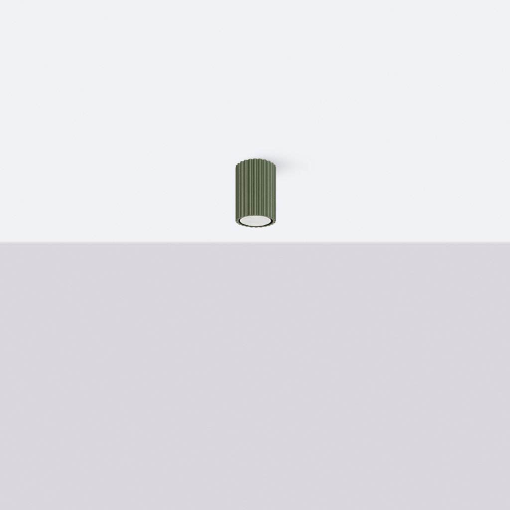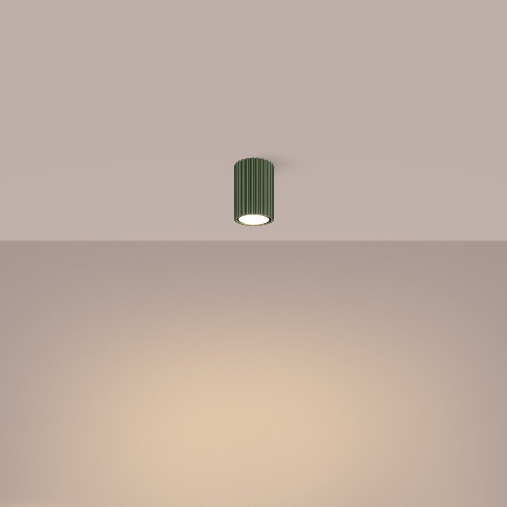 Stropní svítidlo KARBON s jedním olivově zeleným kovovým stínidlem je elegantní a moderní osvětlení, které zaujme svým jednoduchým tvarem a jedinečnou žebrovanou strukturou. Díky svým kompaktním rozměrům s výškou 10 cm působí nenápadně, přesto dodá interiéru výraz a styl.