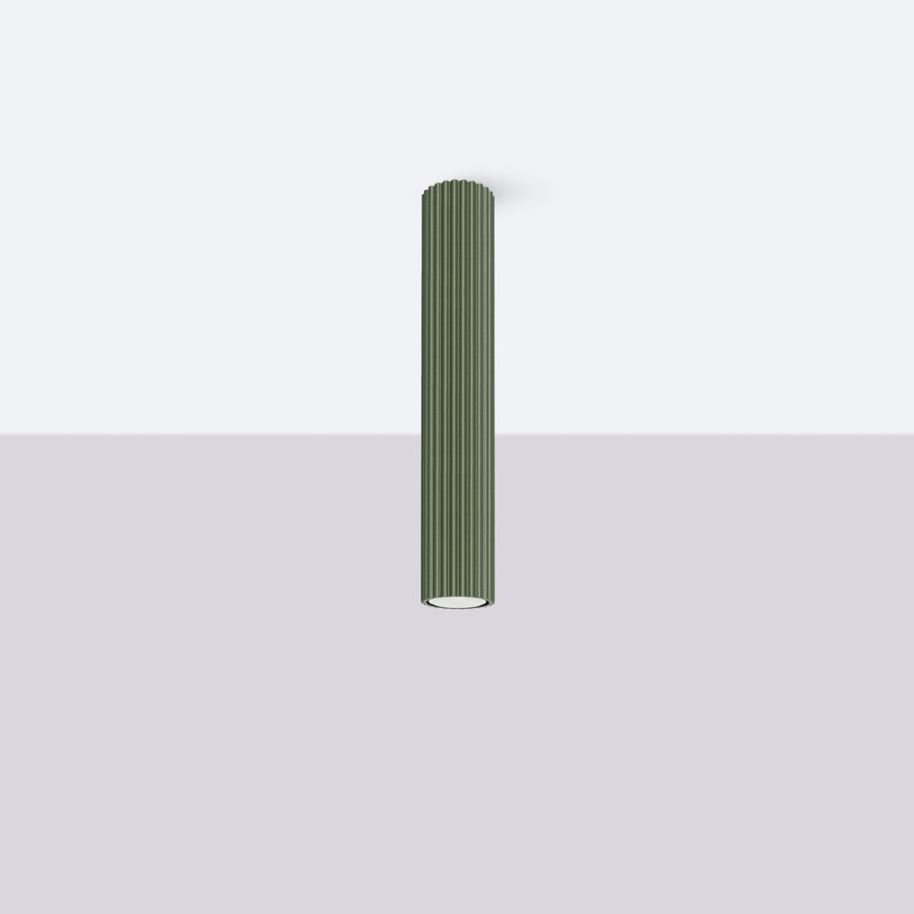Pevná kovová konstrukce zajišťuje stabilitu a dlouhou životnost, zatímco žebrovaný povrch zjednodušuje údržbu a zvyšuje vizuální atraktivitu svítidla. olivově zelená povrchová úprava vnáší do prostoru svěží a moderní tón a dokonale se kombinuje se dřevem, bílou nebo šedou barvou.