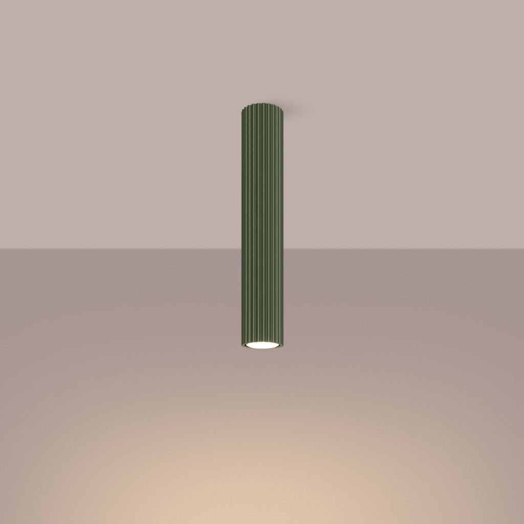 Stropní svítidlo KARBON s jedním olivově zeleným kovovým stínidlem kombinuje moderní design, funkčnost a nenápadnou eleganci. Charakteristický žebrovaný povrch dodává svítidlu jedinečný vzhled a jemný industriální nádech, který se skvěle hodí do moderních, minimalistických a přírodních interiérů.