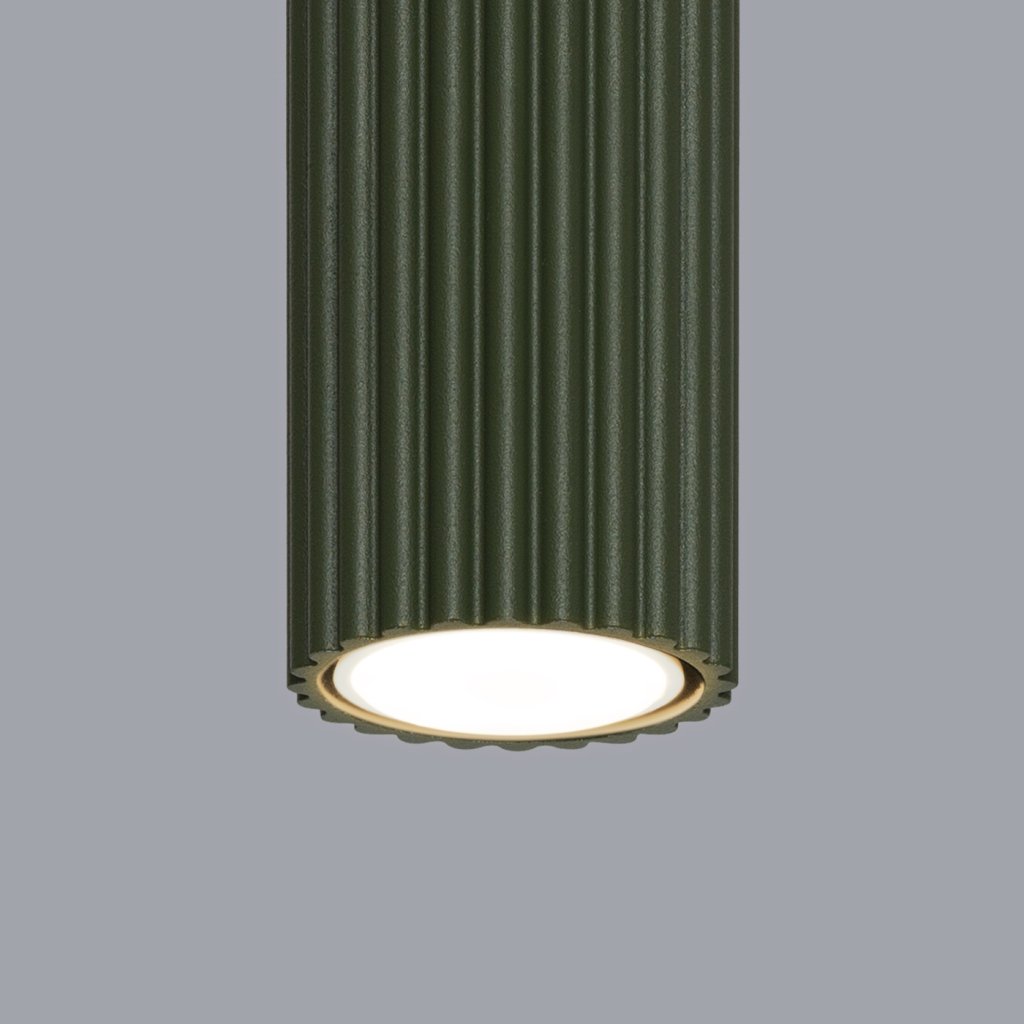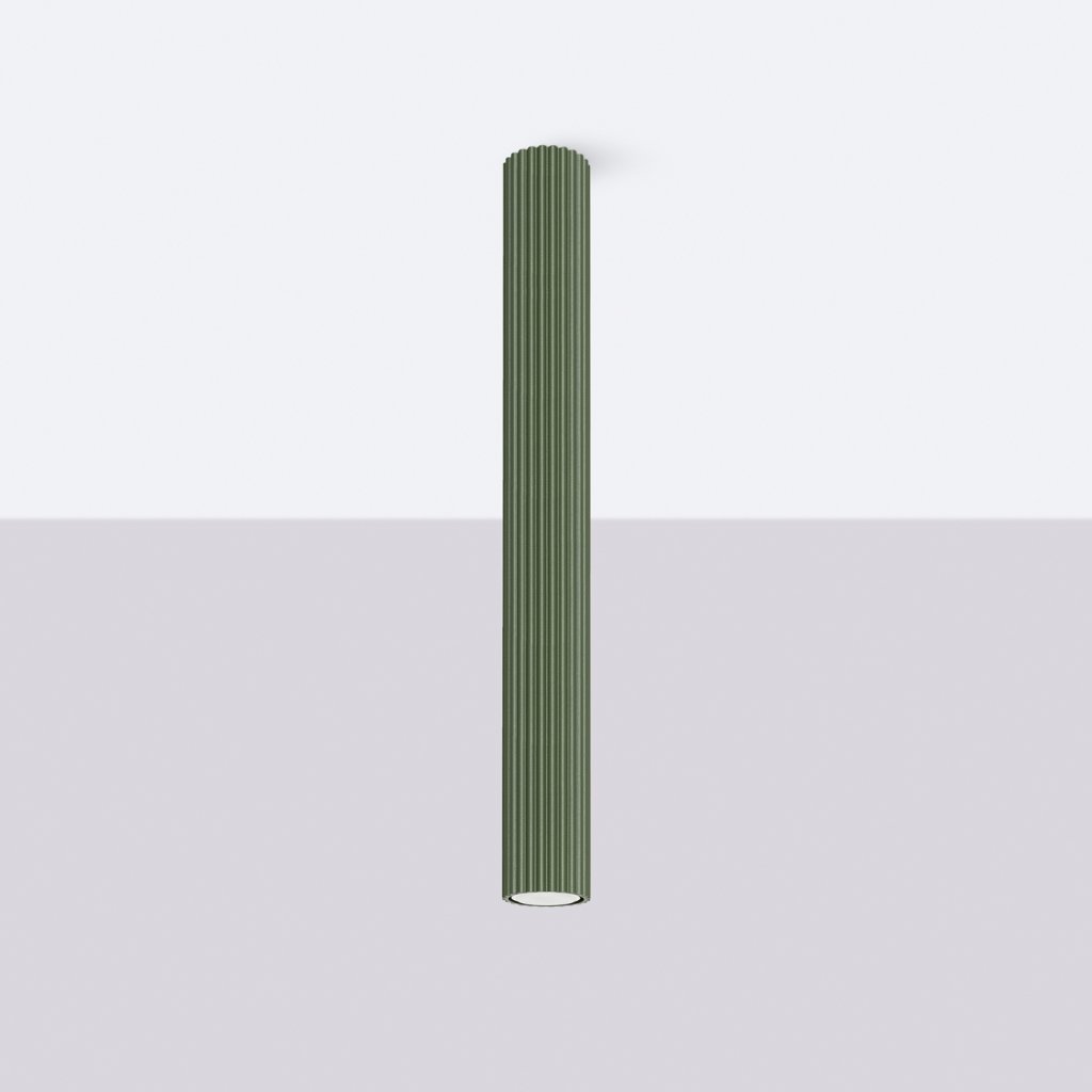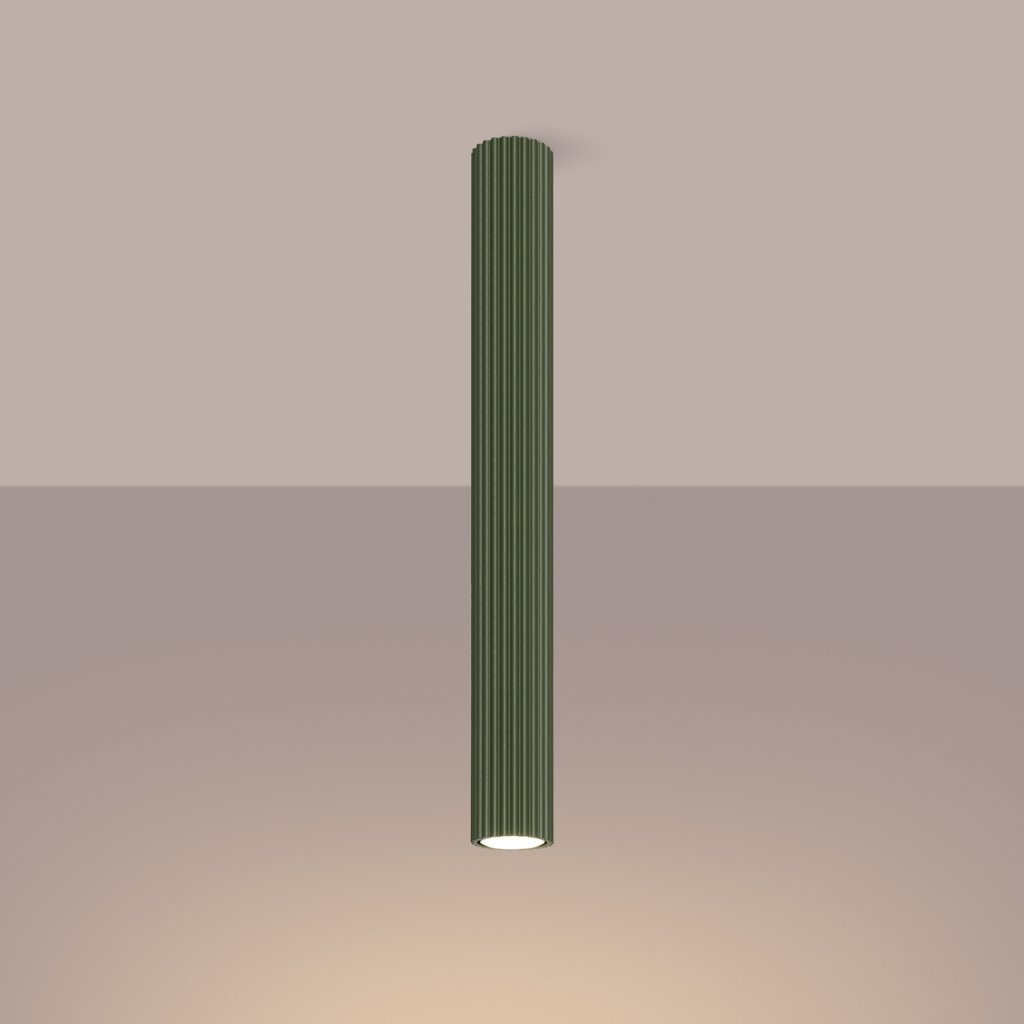 Stropní svítidlo KARBON s jedním olivově zeleným kovovým stínidlem vyniká tenkým tvarem a elegantním minimalistickým designem. Žebrovaný povrch dodává svítidlu jedinečný charakter a jemně industriální nádech, který se skvěle hodí do moderních, skandinávských a loftových interiérů.
