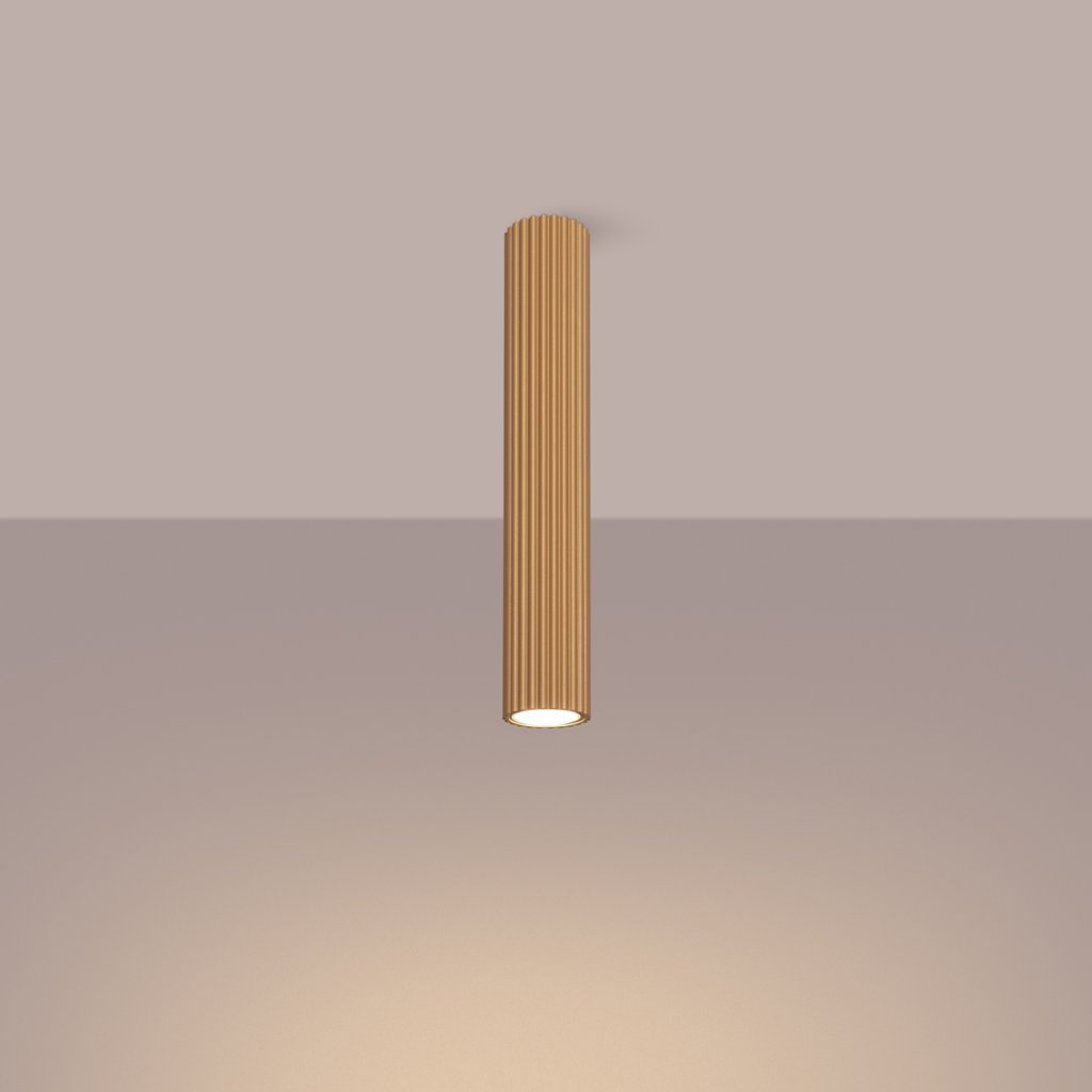 Stropní svítidlo KARBON s jedním zlatým kovovým stínidlem o délce 40 cm je stylový doplněk, který zaujme svou elegancí a precizním zpracováním. Minimalistický válcový tvar s jemnou žebrovanou strukturou působí moderně a díky zlatému stínidlu vnáší do interiéru teplo a luxusní akcent.