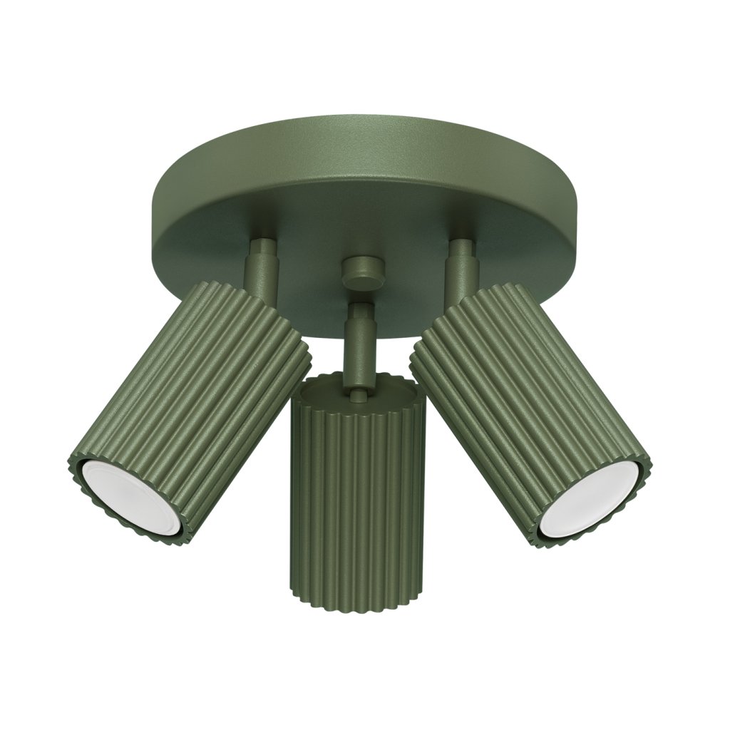 Stropní svítidlo KARBON s třemi olivově zelenými kovovými stínidly v sobě spojuje moderní design, funkčnost a estetickou jednoduchost. Díky svému žebrovanému povrchu zaujme originálním vzhledem a jemným industriálním charakterem, který se skvěle hodí do moderních, loftových a minimalistických interiérů.