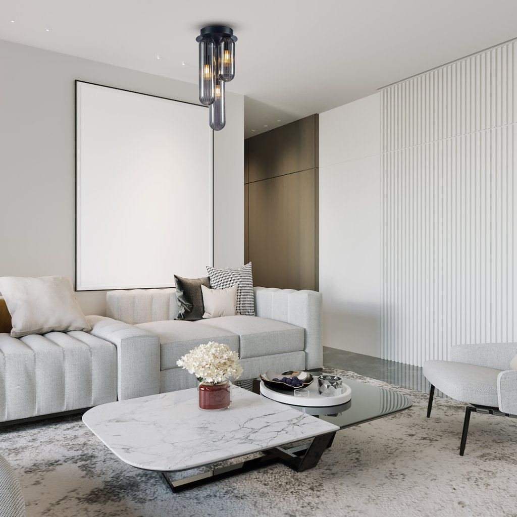 Grafitová stínítka z tónovaného skla jemně rozptylují světlo, čímž vytvářejí útulnou atmosféru bez oslnění. Díky třem světelným bodům je svítidlo ideální pro kuchyně, předsíně či menší obývací pokoje , kde zajistí rovnoměrné osvětlení.