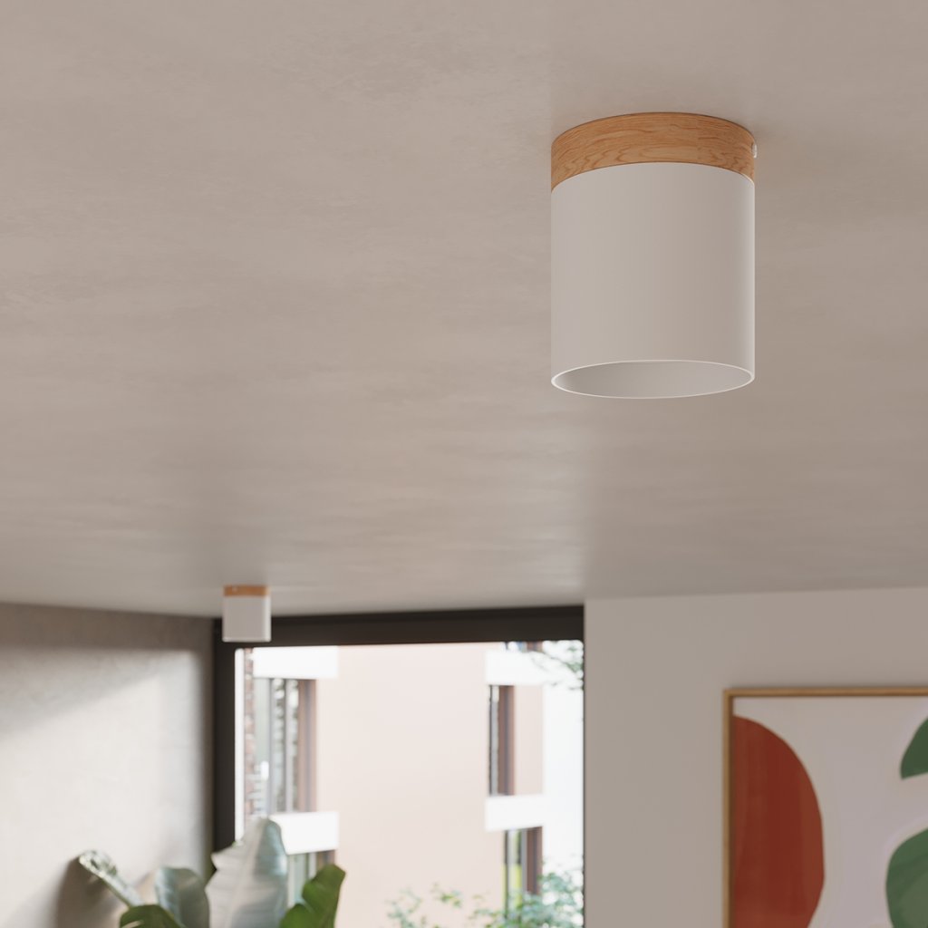 Stropní svítidlo Rif, 1x bílé kovové stínítko, dřevo