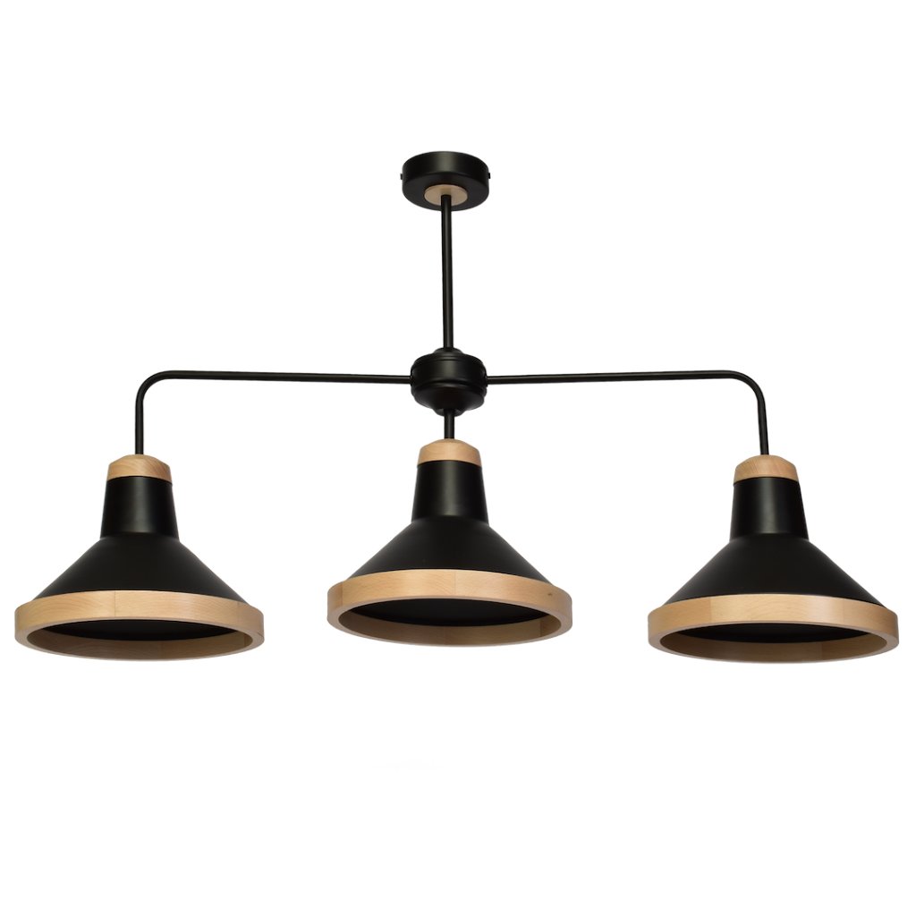 Stropní svítidlo z kolekce SALMA kombinuje černý matný kov s přírodním bukovým dřevem a vytváří tak elegantní a zároveň útulný prvek interiéru. Tři kuželovitá stínítka uspořádaná vedle sebe dodávají svítidlu výrazný charakter a zajišťují rovnoměrné osvětlení větší plochy.