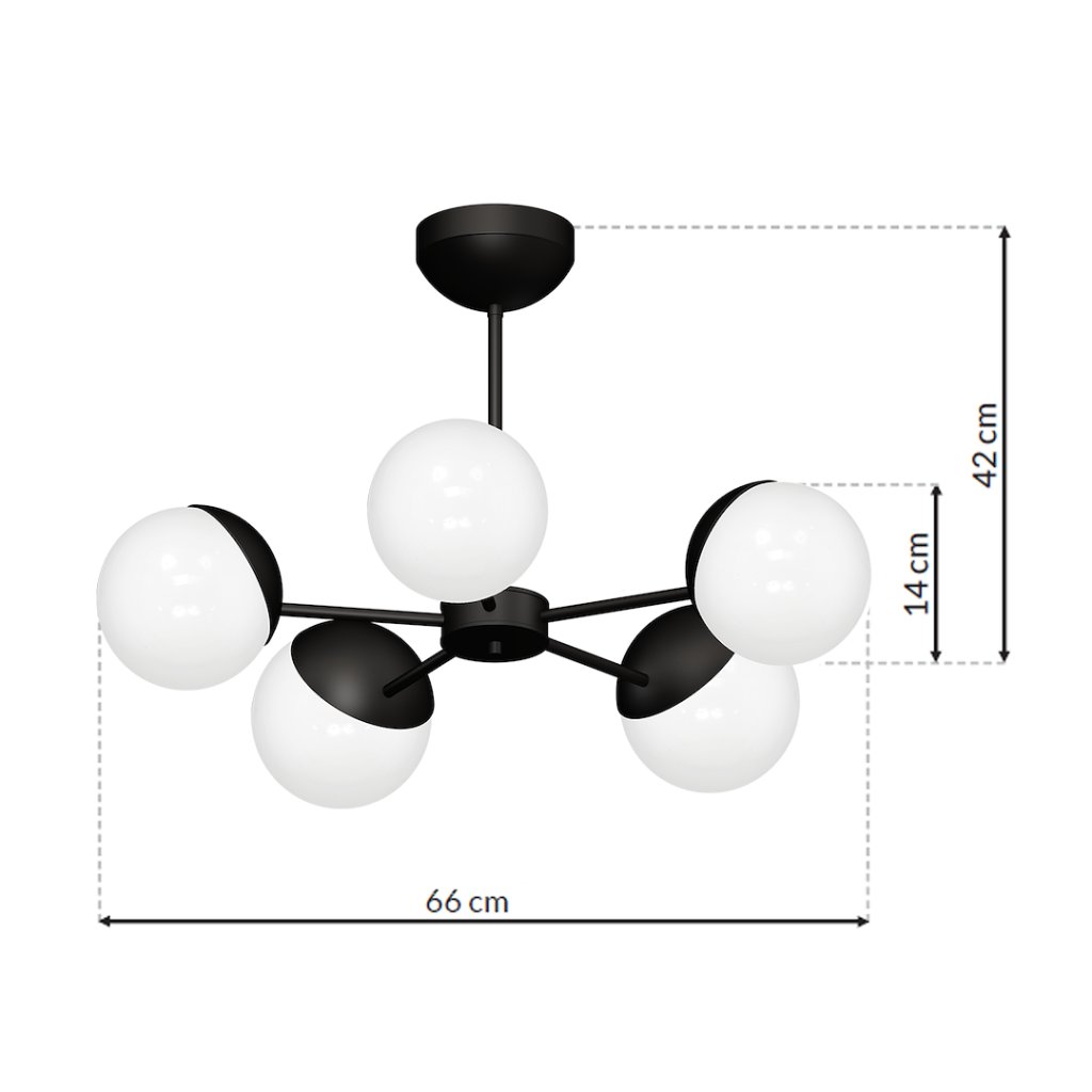 Stropní svítidlo z kolekce SFERA s pěti bílými skleněnými stínítky v prodlouženém uspořádání je navrženo pro prostory, kde je zapotřebí rovnoměrné a intenzivní osvětlení. Kulovitá stínítka z matného skla rozptylují světlo jemně a vytvářejí příjemnou světelnou atmosféru bez oslnění.