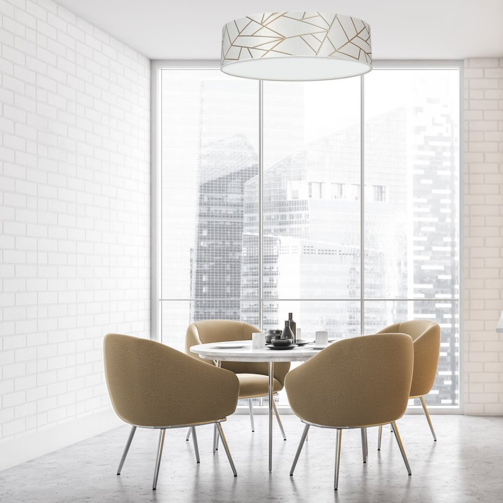 Moderní stropní svítidlo ze série ZIGGY v kulatém provedení o průměru 50 cm kombinuje bílé textilní stínítko se zlatými akcenty a bílým plexisklem. Geometrický vzor na povrchu stínítka dodává svítidlu výjimečný vzhled, který se dokonale hodí do elegantních a moderních interiérů.