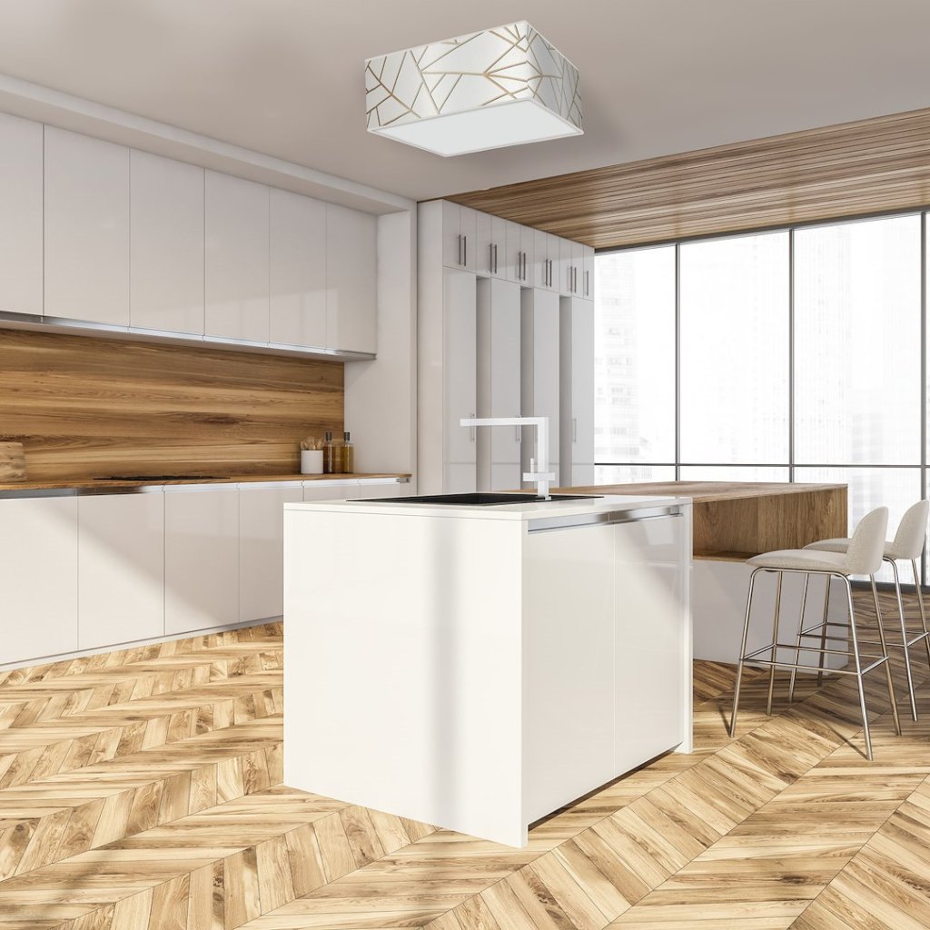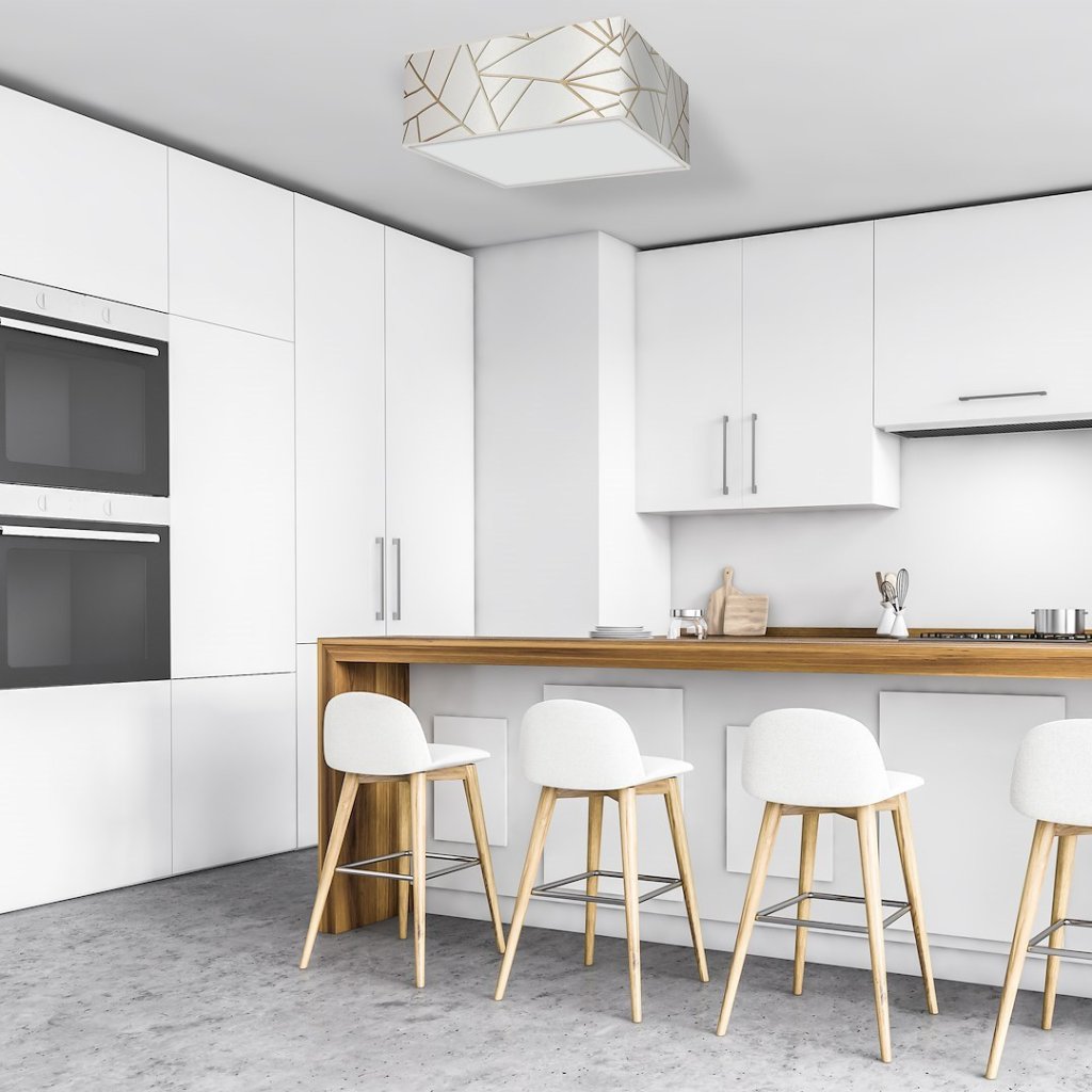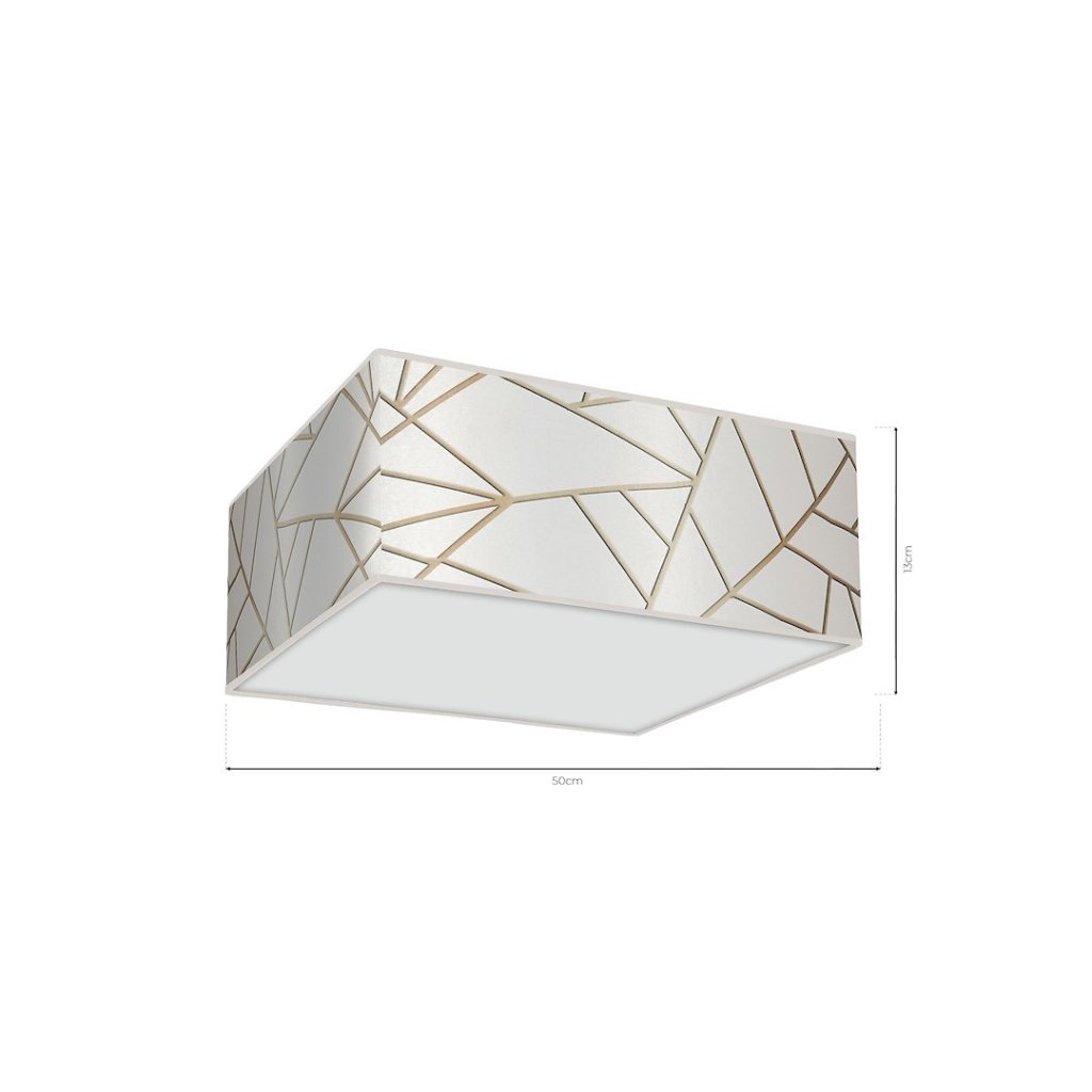 Stylové stropní svítidlo ze série ZIGGY ve čtvercovém provedení o rozměru 50 cm kombinuje bílé textilní stínítko se zlatými akcenty a bílým plexisklem. Geometrický vzor na povrchu stínítka dodává svítidlu originální a moderní charakter, ideální do elegantních současných interiérů.