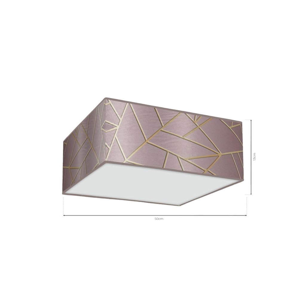 Elegantní stropní svítidlo ze série ZIGGY ve čtvercovém provedení o rozměru 50 cm kombinuje růžové textilní stínítko se zlatými akcenty a bílým plexisklem. Geometrický vzor na povrchu stínítka podtrhuje jemný, moderní design, který perfektně zapadne do stylových a ženských interiérů.